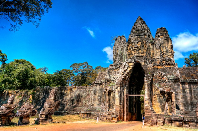 The South Gate, the best-preserved entrance, is the most commonly used entry point for visitors. The approach to the gate is flanked by statues; 54 on each side. On the left are gods while those fierce-looking ones on the right are demons or asuras. This arrangement is taken from the story of the Churning of the Ocean of Milk illustrated in the famous bas-relief at Angkor Wat.