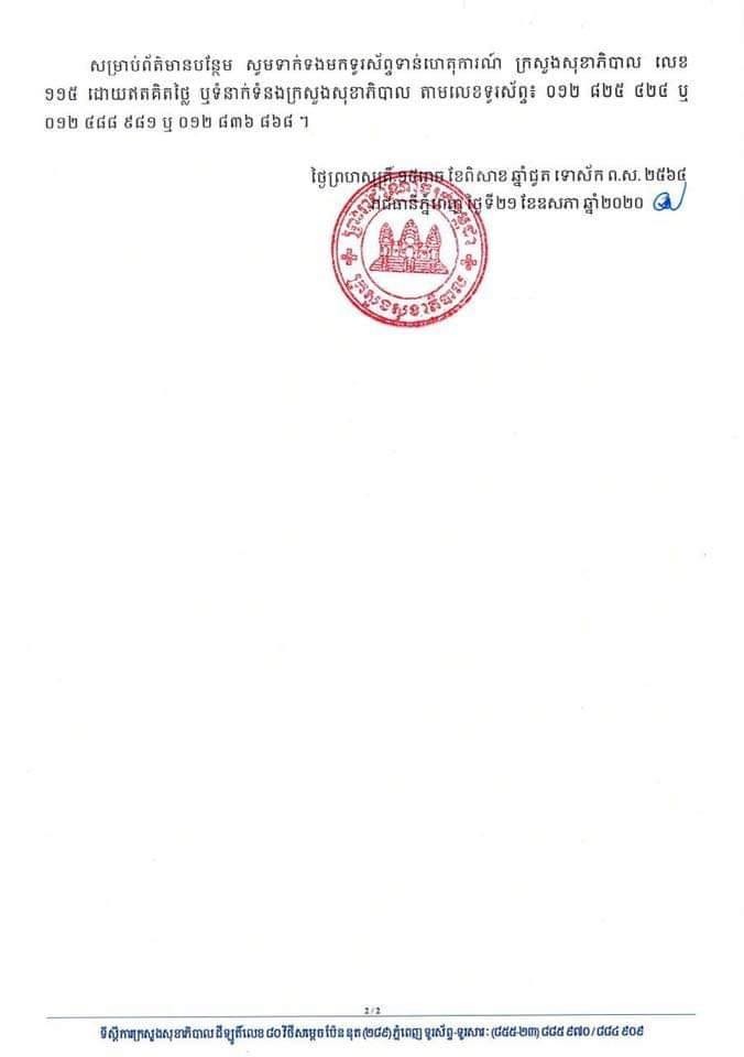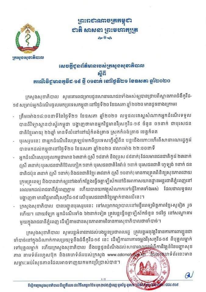 ក្រសួងសុខាភិបាល ប្រកាសរកឃើញករណីវិជ្ជមានជំងឺកូវីដ-១៩ថ្មីចំនួន ១នាក់ នៅថ្ងៃទី២១ ខែឧសភា ២០២០