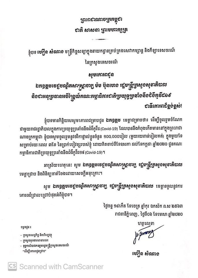 បៀវត្សរបស់ខ្ញុំ ដោយគិតចាប់ពីខែ ឧសភា ដល់ខែ​ កក្កដា ឆ្នាំ២០២០ ជូនគណៈកម្មាធិការជាតិប្រយុទ្ធ ប្រឆាំងនឹងជំងឺកូវីដ១៩ (Covid-19)។