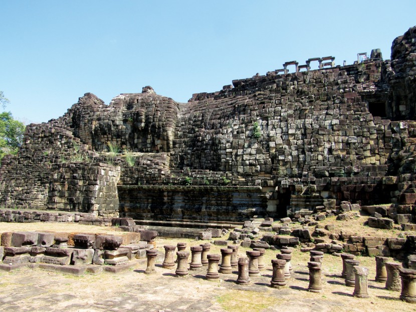 Baphuon : Huge temple-mountain in the heart of Angkor Thom. Largely collapsed and in ruined condition, the main temple area is undergoing extensive restoration. Most of the construction area is not open to the public but over the last several months, certain areas have begun to open to the public. The exterior entry gate and elevated causeway are open as well as some areas around the perimeter of the construction. Note the unique animal carving at the walkway entrance. Similar carvings are visible on West Mebon. Also note the large reclining Buddha on the west side, which was added to the temple at a much later period.