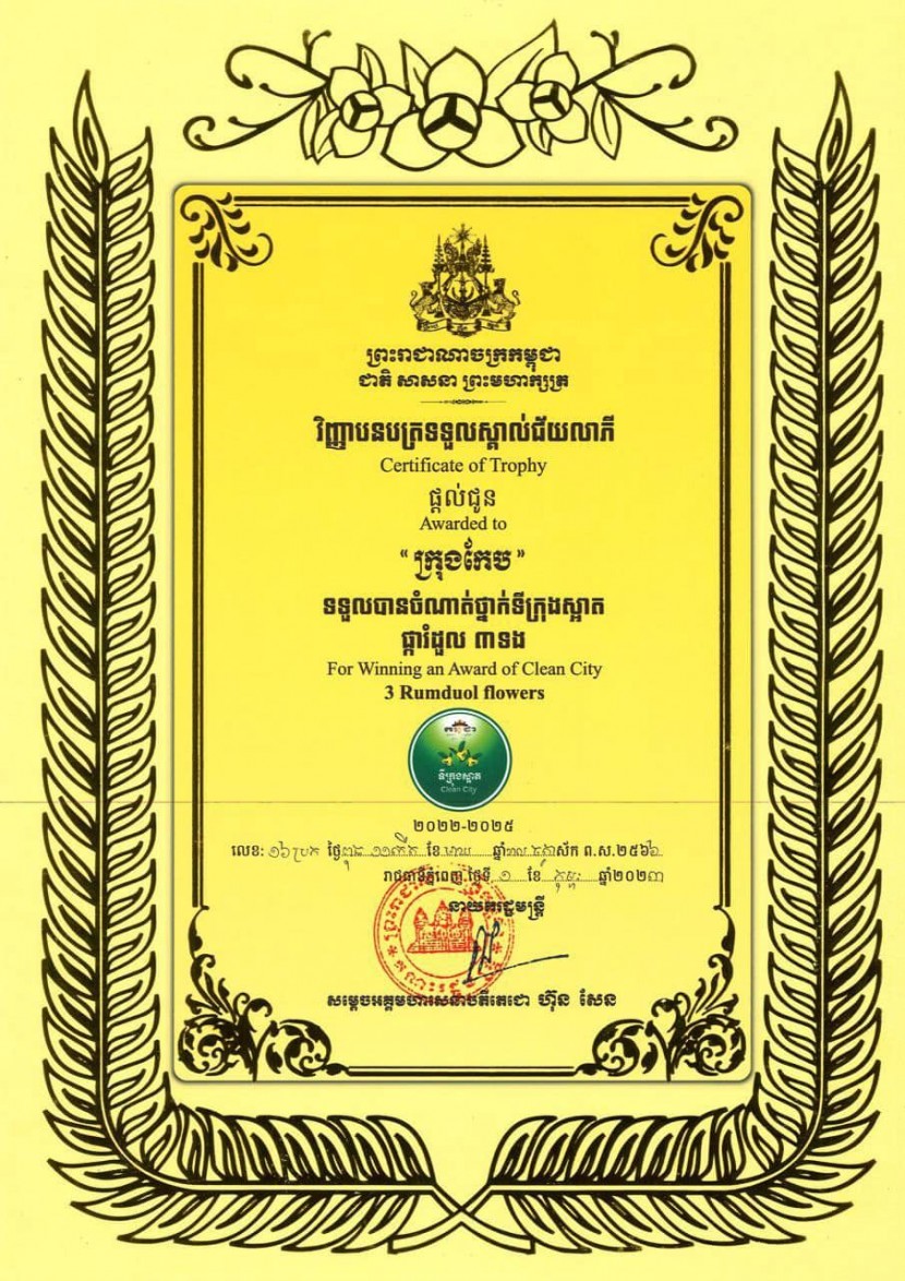 គណៈកម្មាធិការជាតិវាយតម្លៃទីក្រុងស្អាតសូមអបអរសាទរជ័យលាភី "ក្រុងកែប” នៃខេត្តកែប ដែលទទួលបានចំណាត់ថ្នាក់ទីក្រុងស្អាតផ្ការំដួល ៣ទង នាឱកាសពិធីប្រគល់ជ័យលាភីទីក្រុងស្អាតលើកទី៣ សុពលភាព ឆ្នាំ២០២២-២០២៥ ដែលបានប្រព្រឹត្តទៅក្រោមអធិបតីភាពដ៏ខ្ពង់ខ្ពស់បំផុតរបស់ សម្តេចអគ្គមហាសេនាបតីតេជោ ហ៊ុន សែន នាយករដ្ឋមន្ត្រី នៃព្រះរាជាណាចក្រកម្ពុជា កាលពីរសៀលថ្ងៃទី២៧ ខែកុម្ភៈ ឆ្នាំ២០២៣។