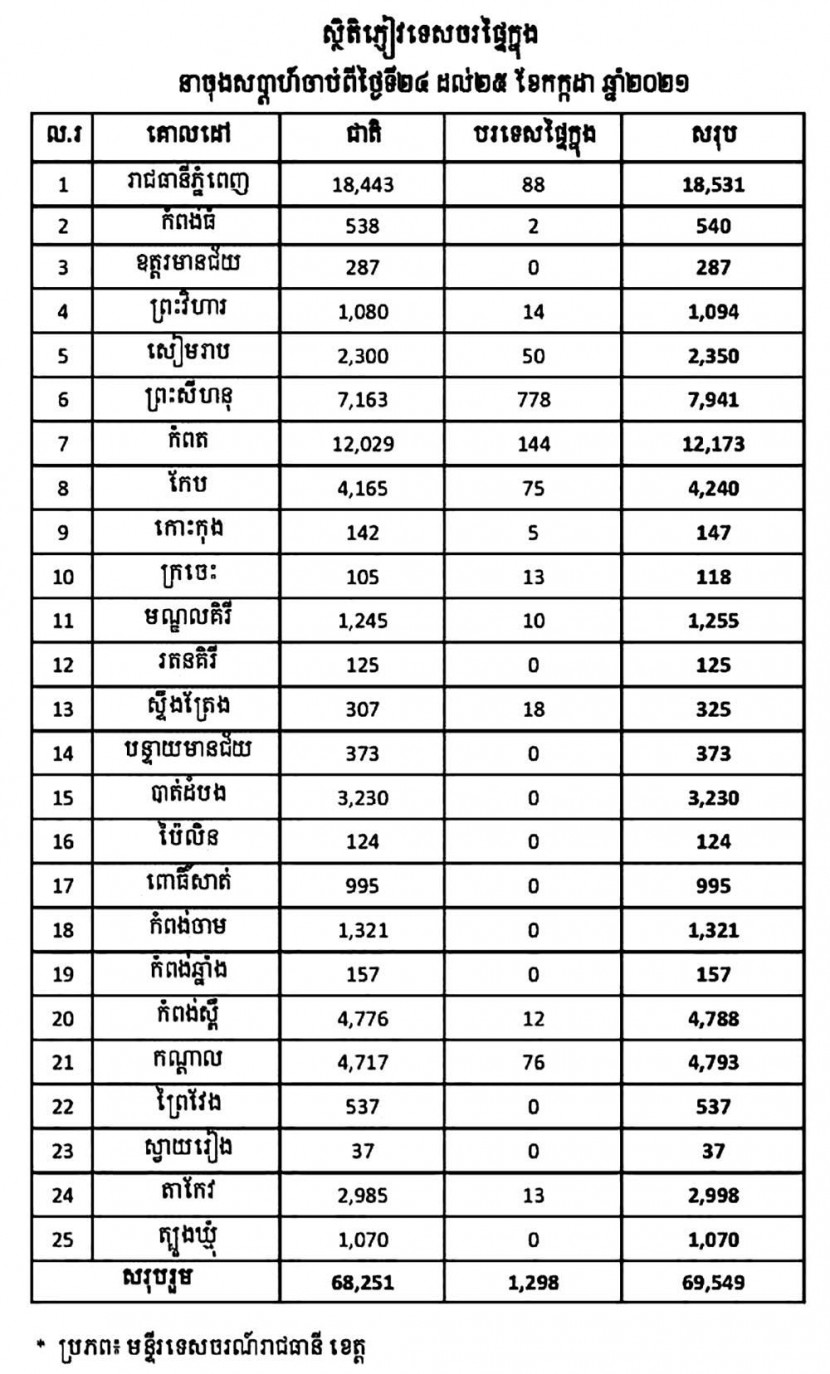 (ភ្នំពេញ)៖ រយៈពេលពីរថ្ងៃ ២៤-២៥ ខែកក្កដា ឆ្នាំ២០២១ នៅទូទាំងប្រទេសកម្ពុជាមានភ្ញៀវទេសចរដើរលេងកម្សាន្តសរុប ៦៩,៥៤៩ នាក់ ក្នុងនោះភ្ញៀវជាតិ ៦៨,២៥១ នាក់ និងភ្ញៀវបរទេសផ្ទៃក្នុង ១,២៩៨ នាក់។ នេះបើតាមឯកឧត្ដម ថោង ខុន រដ្ឋមន្ត្រីក្រសួងទេសចរណ៍ ដែលបានបញ្ជាក់នៅថ្ងៃទី២៦ ខែកក្កដា ឆ្នាំ២០២១នេះ។