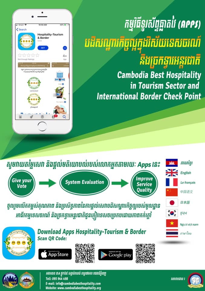 ភ្ញៀវទេសចរ​ជាតិ និង ​អន្ដរជាតិ​អាច​ចូលរួម​វាយតម្លៃ​ចលនា​ប្រឡងប្រណាំង​បដិសណ្ឋារកិច្ច​ល្អ​ក្នុង​ទេសចរណ៍ ​ដោយ​គ្រាន់តែ​ទាញ យក (Download)​កម្មវិធី​ទូរស័ព្ទ​ឆ្លាត​វៃ (Mobile Apps) ឈ្មោះថា​៖ “Hospitality-Tourism &Border” ពី (App Store ចំពោះ​ទូរស័ព្ទ IPhone តាម​តំណ​លី​ង​៖ https://goo.gl/CF4AMy និង Play Store តាមរយៈ​តំណ​លី​ង​៖ https://goo.gl/W3uBxx សម្រាប់​ទូរស័ព្ទ Android) រួច​ធ្វើ​តាម​ការណែនាំ​។​