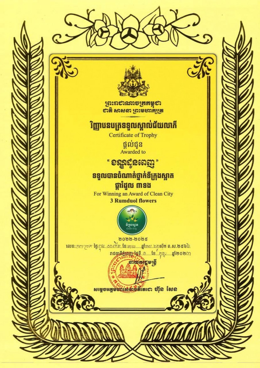 គណៈកម្មាធិការជាតិវាយតម្លៃទីក្រុងស្អាតសូមអបអរសាទរជ័យលាភី "ខណ្ឌដូនពេញ” រាជធានីភ្នំពេញ ដែលទទួលបានចំណាត់ថ្នាក់ទីក្រុងស្អាតផ្ការំដួល ៣ទង នាឱកាសពិធីប្រគល់ជ័យលាភីទីក្រុងស្អាតលើកទី៣ សុពលភាព ឆ្នាំ២០២២-២០២៥ ដែលបានប្រព្រឹត្តទៅក្រោមអធិបតីភាពដ៏ខ្ពង់ខ្ពស់បំផុតរបស់ សម្តេចអគ្គមហាសេនាបតីតេជោ ហ៊ុន សែន នាយករដ្ឋមន្ត្រី នៃព្រះរាជាណាចក្រកម្ពុជា កាលពីរសៀលថ្ងៃទី២៧ ខែកុម្ភៈ ឆ្នាំ២០២៣។