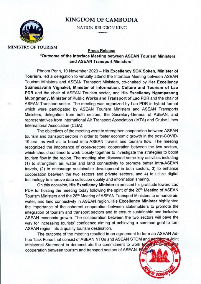 សេចក្តីប្រកាសព័ត៌មាន ស្តីពីលទ្ធផលនៃការចូលរួមកិច្ចប្រជុំស្តីពីការងារដែលផ្សារភ្ជាប់គ្នារវាងរដ្ឋមន្រ្តីទេសចរណ៍អាស៊ាន និងរដ្ឋមន្រ្តីដឹកជញ្ជូនអាស៊ាន តាមប្រព័ន្ធវីដេអូ