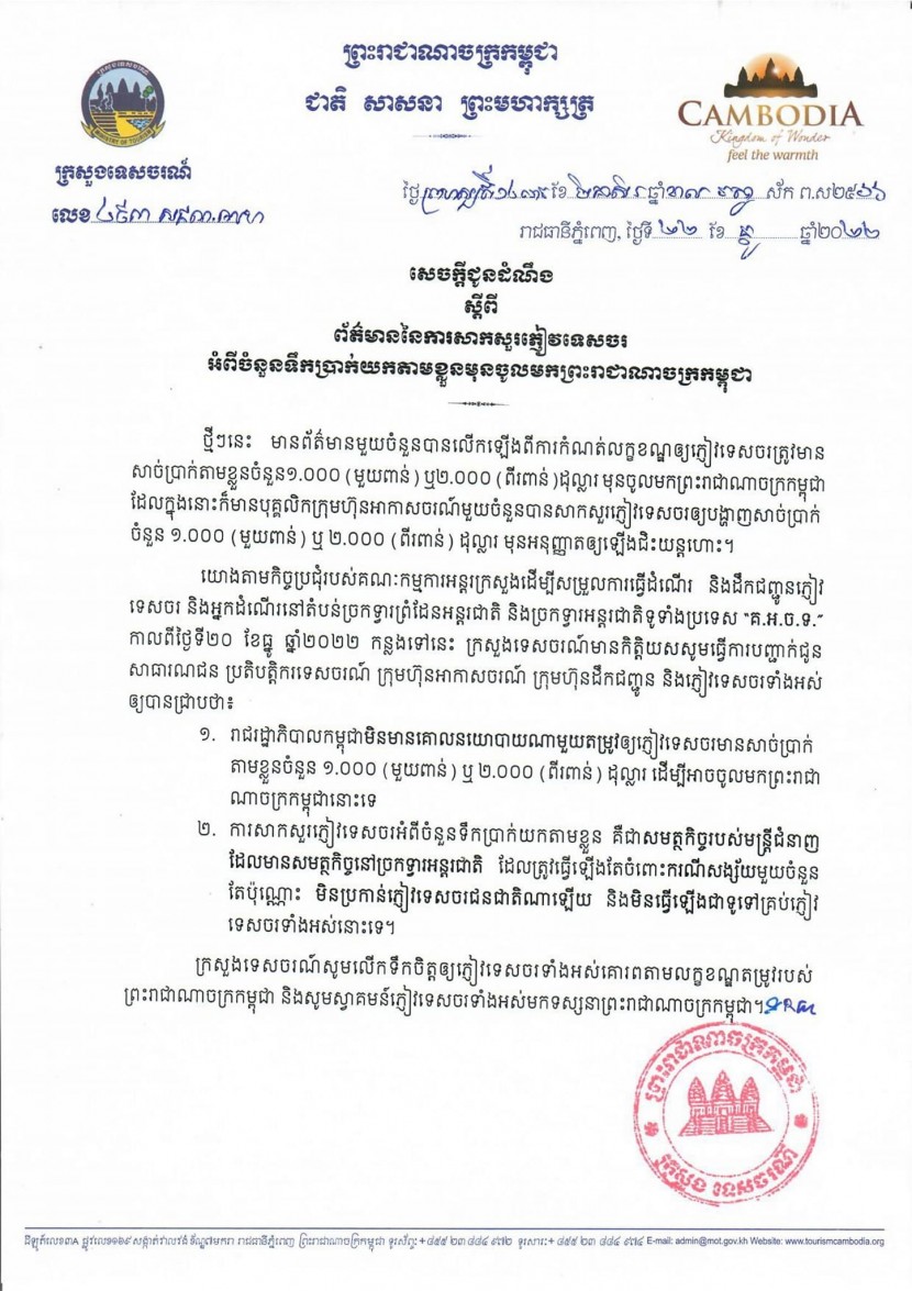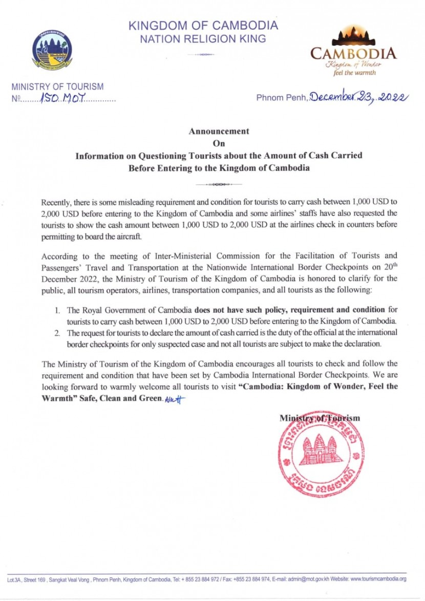 សេចក្តីជូនដំណឹងលេខ ៤៩៣ សជណ ចុះថ្ងៃទី២២ ខែធ្នូ ឆ្នាំ២០២២ របស់ក្រសួងទេសចរណ៍ ស្តីពី ព័ត៌មាននៃការសាកសួរភ្ញៀវទេសចរអំពីចំនួនទឹកប្រាក់យកតាមខ្លួនមុនចូលមកព្រះរាជាណាចក្រកម្ពុជា