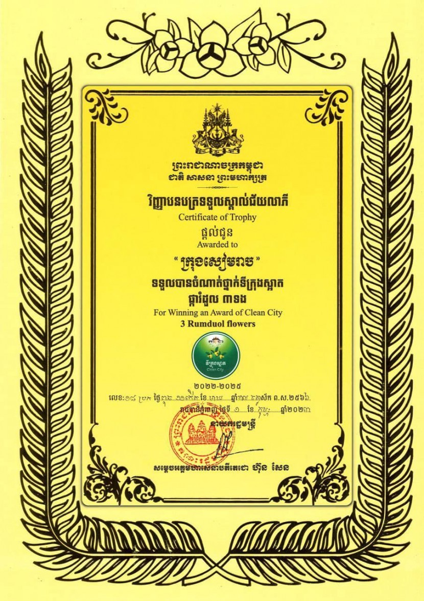 សូមអបអរសាទរជ័យលាភី "ក្រុងសៀមរាប” នៃខេត្តសៀមរាប ដែលទទួលបានចំណាត់ថ្នាក់ទីក្រុងស្អាតផ្ការំដួល ៣ទង