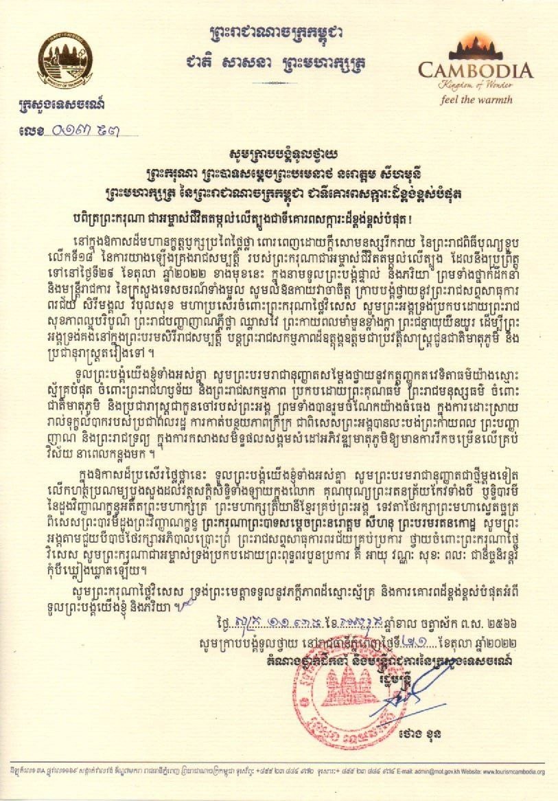 សារលិខិតថ្វាយព្រះពររបស់ឯកឧត្តម ថោង ខុន រដ្ឋមន្ត្រីក្រសួងទេសចរណ៍ ថ្វាយព្រះករុណាព្រះបាទសម្តេចព្រះបរមនាថ នរោត្តម សីហមុនី ព្រះមហាក្សត្រ នៃព្រះរាជាណាចក្រកម្ពុជា នៅក្នុងឱកាសព្រះរាជពិធីបុណ្យខួបលើកទី១៨ នៃការយាងគ្រងព្រះបរមសិរីរាជសម្បត្តិ។