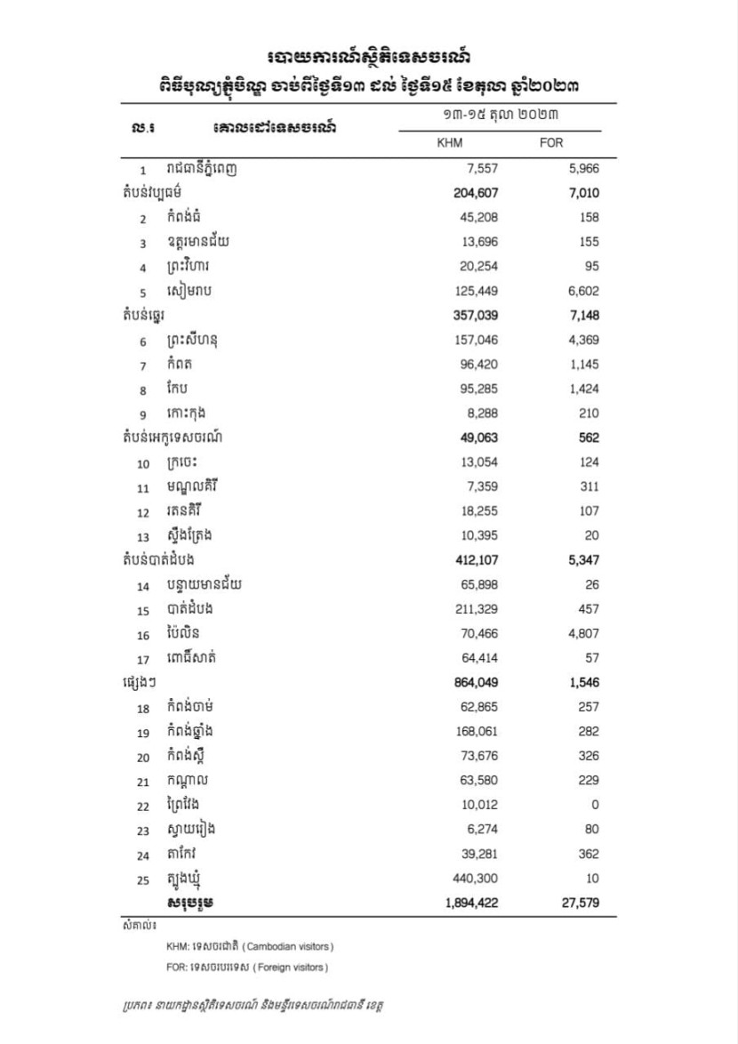 ស្ថានភាពទេសចរណ៍ និងបងប្អូនប្រជាពលរដ្ឋដែលបានដើរកម្សាន្តនាឱកាសពិធីបុណ្យភ្ជំបិណ្ឌ ចាប់ពីថ្ងៃទី១៣ ដល់ ថ្ងៃទី១៥ ខែតុលា ឆ្នាំ២០២៣
