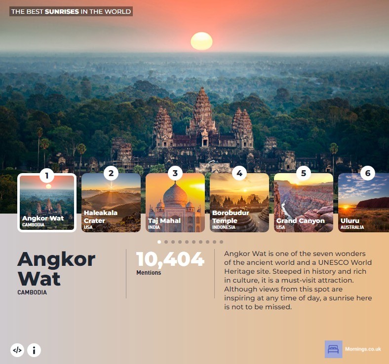 The survey adds that “The Cambodian temple complex has two and a half times more mentions for its sunrise than any other attraction in the world”