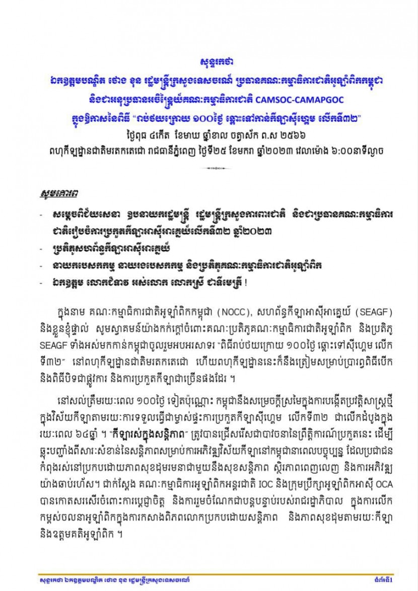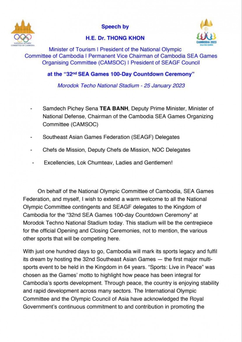 សុន្ទរកថា ឯកឧត្តម ថោង ខុន រដ្ឋមន្រ្តីក្រសួងទេសចរណ៍ ប្រធានគណៈកម្មាធិការជាតិអូឡាំពិកកម្ពុជា និងជាអនុប្រធានអចិន្រ្តៃយ៍គណៈកម្មាធិការជាតិ CAMSOC CAMAPGOC ក្នុងឱកាសនៃពិធី”រាប់ថយក្រោយ១០០ថ្ងៃ ឆ្ពោះទៅកាន់កីឡាសុីហ្គេម លេីកទី៣២” នៅពហុកីឡដ្ឋានជាតិមរតកតេជោ។