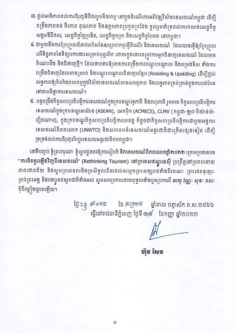 សារលិខិត សម្ដេចអគ្គមហាសេនាបតីតេជោ ហ៊ុន សែន នាយករដ្ឋមន្ត្រីនៃព្រះរាជាណាចក្រកម្ពុជា ក្នុងឱកាសអបអរសាទរទិវាទេសចរណ៍ពិភពលោកឆ្នាំ២០២២ ក្រោមប្រធានបទ ''ការគិតគូរឡើងវិញពីទេសចរណ៍'' (RETHINKING TOURISM)
