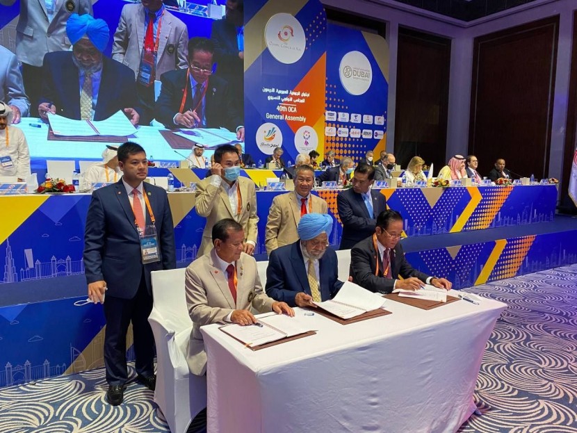 ហត្ថលេខាត្រូវបានចុះហត្ថលេខាធិការដោយ ឯកឧត្ដម ថោង ខុន ក្នុងនាមជាអ្នករៀបចំព្រិត្តិការណ៍និងឯកឧត្ដម ឃួង ស្រេង ក្នុងនាមទីក្រុងម្ចាស់ផ្ទះ ឯកឧត្ដម អ៊ុក សិទ្ធជាតិ ដំណាង ក្រសួង អប់រំយុវជនកីឡា ជាសាក្សី ជាមួយ លោក Randhir Shing ប្រធានស្តីទី ក្រុមប្រឹក្សាអូឡាំពិកអាសុី។ ពិធីចុះហត្ថលេខាបានប្រព្រិត្តិទៅ ក្រោមការអបអរសាទរយ៉ាងកក់ក្តៅពីថ្នាក់ដឹកនាំក្រុមប្រឹក្សាអូឡាំពិកអាសុី និងចលនាអូឡាំពិកអាសុីទាំង ៤៥ ប្រទេស ដែលបានចូលរួមក៏បានសម្តែងនូវការអបអរសាទរ និងកោតសរសេីរភាពសកម្មនៃការអភិវឌ្ឍ ចលនាកីឡាក្នុងតំបន់ និងទ្វិបអាសុីរបស់កម្ពុជា ។
