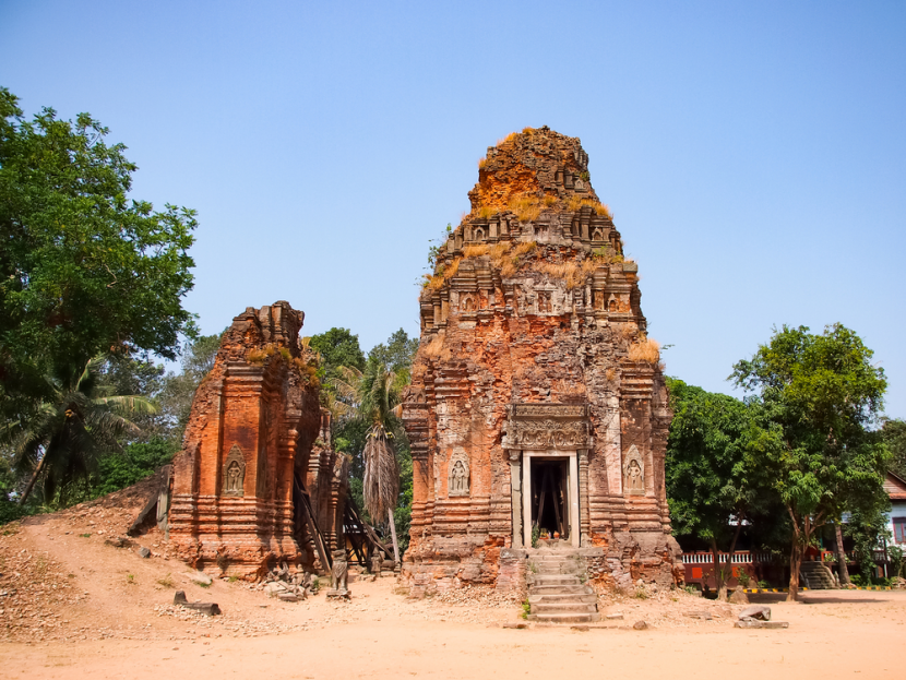 Roluos Group: Ruins of an island-temple built in the middle of a now dry baray, Indratataka, the first large-scale baray constructed by a Khmer king. Lolei consists of four brick towers on a double laterite platform. It was the last major temple built at Roluos before Yasovarman I moved the capital to the Angkor area. Though the towers are in poor condition, there are some lintel carvings in very good condition displaying the distinctively detailed Preah Ko style. An active pagoda has been built amongst the ruins. Of the Roluos Group ruins, allocate the least time Lolei. See ´Roluos Group´ and ´Baray´.