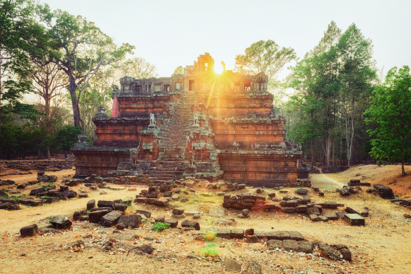 Impressive laterite and sandstone pyramid. The lack surviving carvingleaves it artistically uninteresting. But it is the tallest scalable temple in Angkor Thom, providing a nice view from the top. The western staircase (at the back) is the most easily ascended. Located inside the ancient Royal Palace compound, Phimeanakas served as the king’s temple. Legend has it that the golden tower crowned the temple and was inhabited by a serpent, which would transform into a women. The kings of Angkor were required to make love with the serpent every night, lest disaster befall him or the kingdom.