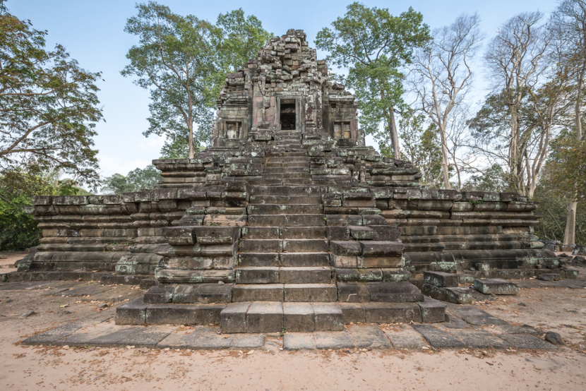 Five small temples set in a quiet area opposite the Terrace of the Leper King. Most of the construction is from the 12 th century but one of the temples is Buddhist and may date from the 14th century. The temples are in rough shape but there are interesting carved lintels scattered on the ground. Located in central Angkor Thom but not as touristed as the other temples in area. Peaceful little jungle area behind the group.
