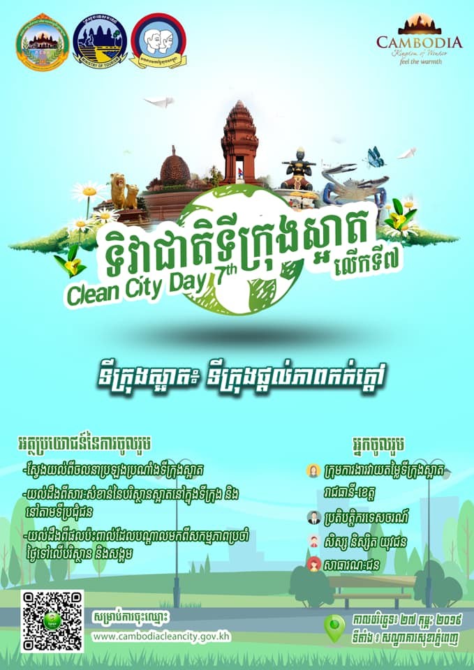 សូម​ចូលរួម​ទិវា​ជាតិ​ទីក្រុង​ស្អាត លេីក​ទី ៧ ក្រោម​ប្រធានបទ “ ទីក្រុង​ស្អាត​៖ ទីក្រុង​ប្រកបដោយ​ភាពកក់ក្តៅ​” ដែល​គ្រោង​នឹង​ប្រព្រឹត្តទៅ​នៅ​ថ្ងៃ​ទី​២៧ ខែ​កុម្ភៈ ឆ្នាំ​២០១៩​