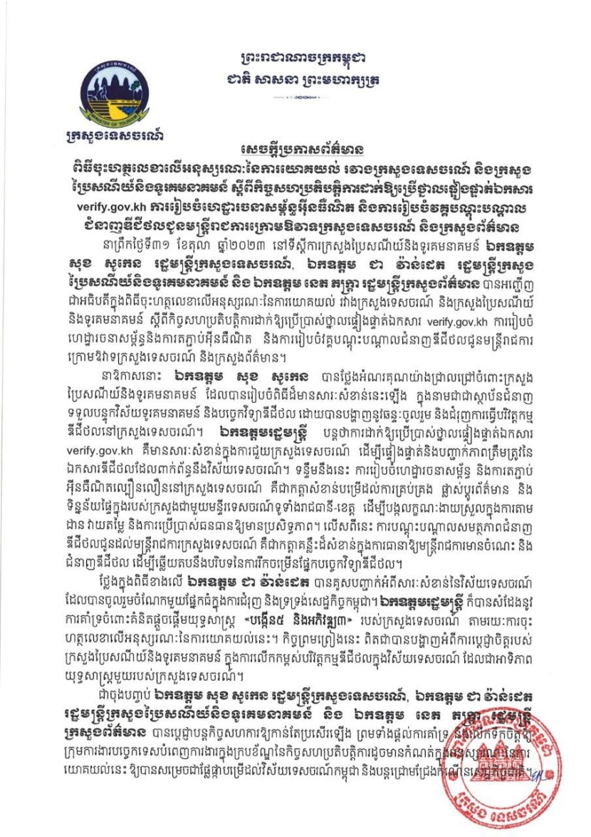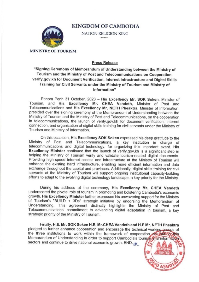 នៅទីស្តីការក្រសួងប្រៃសណីយ៍និងទូរគមនាគមន៍ ថ្ងៃទី៣១ ខែតុលា ឆ្នាំ២០២៣ - ឯកឧត្តម សុខ សូកេន រដ្ឋមន្រ្ដីក្រសួងទេសចរណ៍, ឯកឧត្តម ជា វ៉ាន់ដេត រដ្ឋមន្ត្រីក្រសួងប្រៃសណីយ៍និងទូរគមនាគមន៍ និង ឯកឧត្តម នេត ភក្ត្រា រដ្ឋមន្ត្រីក្រសួងព័ត៌មាន បានអញ្ជើញជាអធិបតីក្នុងពិធីចុះហត្ថលេខាលើអនុស្សរណៈនៃការយោគយល់ រវាងក្រសួងទេសចរណ៍ និងក្រសួងប្រៃសណីយ៍និងទូរគមនាគមន៍ ស្តីពីកិច្ចសហប្រតិបត្តិការដាក់ឱ្យប្រើប្រាស់ថ្នាលផ្ទៀងផ្ទាត់ឯកសារ verify.gov.kh ការរៀបចំហេដ្ឋារចនាសម្ព័ន្ធនិងការតភ្ជាប់អ៊ីនធឺណិត និងការរៀបចំវគ្គបណ្តុះបណ្តាលជំនាញឌីជីថលជូនមន្ត្រីរាជការក្រោមឱវាទក្រសួងទេសចរណ៍ និងក្រសួងព័ត៌មាន។
