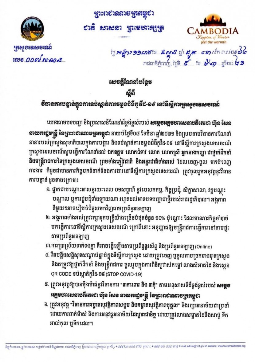 ២៖ អង្គភាពទាំងអស់ត្រូវរក្សាទុកមន្រ្តីយ៉ាងច្រើនបំផុតចំនួន ១០% ប៉ុណ្ណោះ ដែលមានភារកិច្ចចាំបាច់មកធ្វើការនៅទីស្ដីការក្រសួងទេសចរណ៍ ក្រៅពីនោះអនុញ្ញាតឱ្យមន្រ្តីរាជការធ្វើការនៅតាមផ្ទះតាមប្រព័ន្ធអនឡាញ។