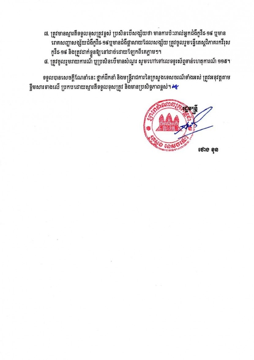(ភ្នំពេញ)៖ យោងតាមបទបញ្ជា និងប្រសាសន៍ណែនាំរបស់សម្ដេចតេជោ ហ៊ុន សែន នាយករដ្ឋមន្ត្រីនៃកម្ពុជា និងស្របតាមវិធានការណែនាំនានារបស់ក្រសួងសុខាភិបាល លោក ថោង ខុន រដ្ឋមន្ត្រីក្រសួងទេសចរណ៍ បានចេញសេចក្ដីណែនាំបន្ថែមដល់ថ្នាក់ដឹកនាំ និងមន្រ្តីរាជការនៃក្រសួងទេសចរណ៍ ព្រមទាំងភ្ញៀវជាតិ-អន្តរជាតិទាំងអស់ដែលចេញ-ចូលទីស្ដីការក្រសួងទេសចរណ៍ អំពីការអនុវត្តវិធានការចាំបាច់មួយចំនួនក្នុងការបង្ការ និងទប់ស្កាត់ការចម្លងជំងឺកូវីដ-១៩។