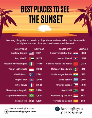 A new survey by Ranking Royals – based on TripAdvisor mentions of the best sunset spots – ranks Cambodia’s iconic Angkor Wat as the 6th best spot in the world