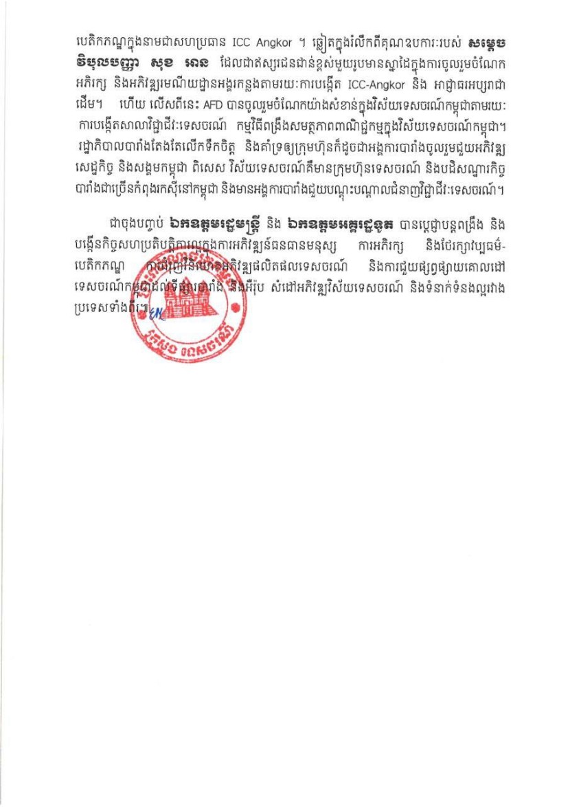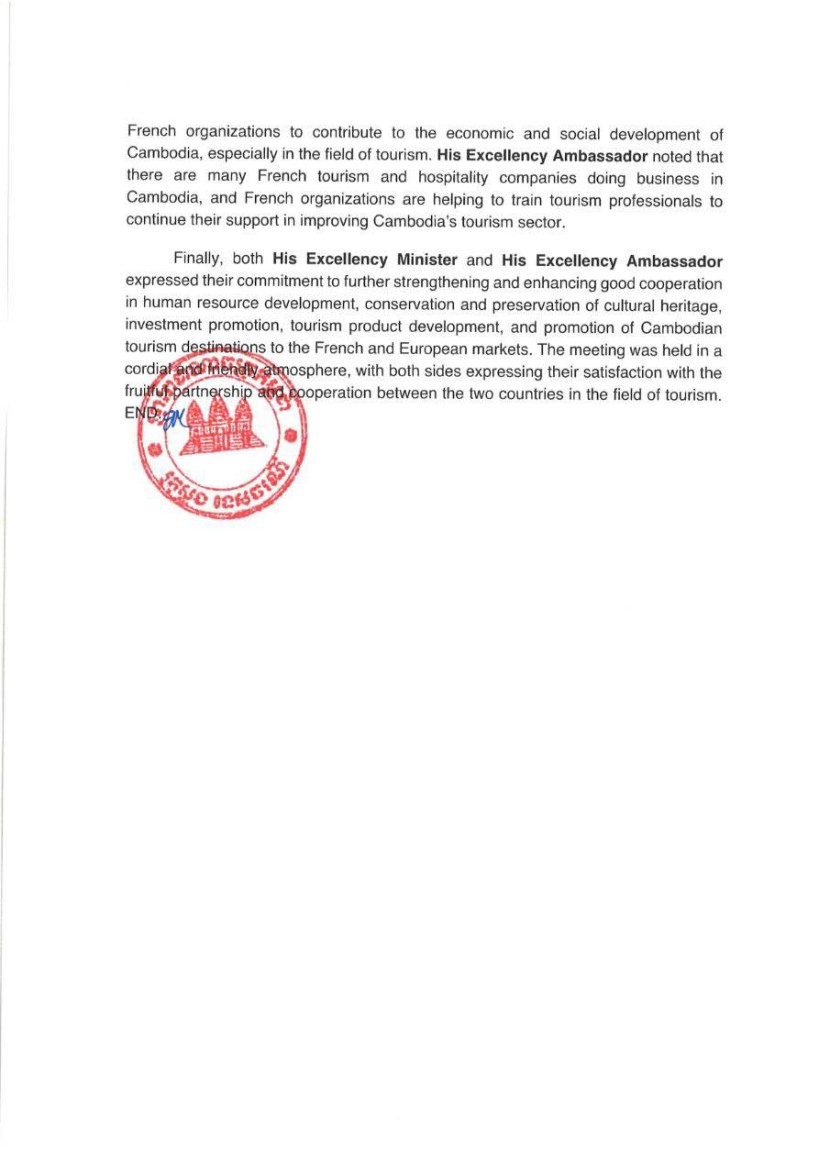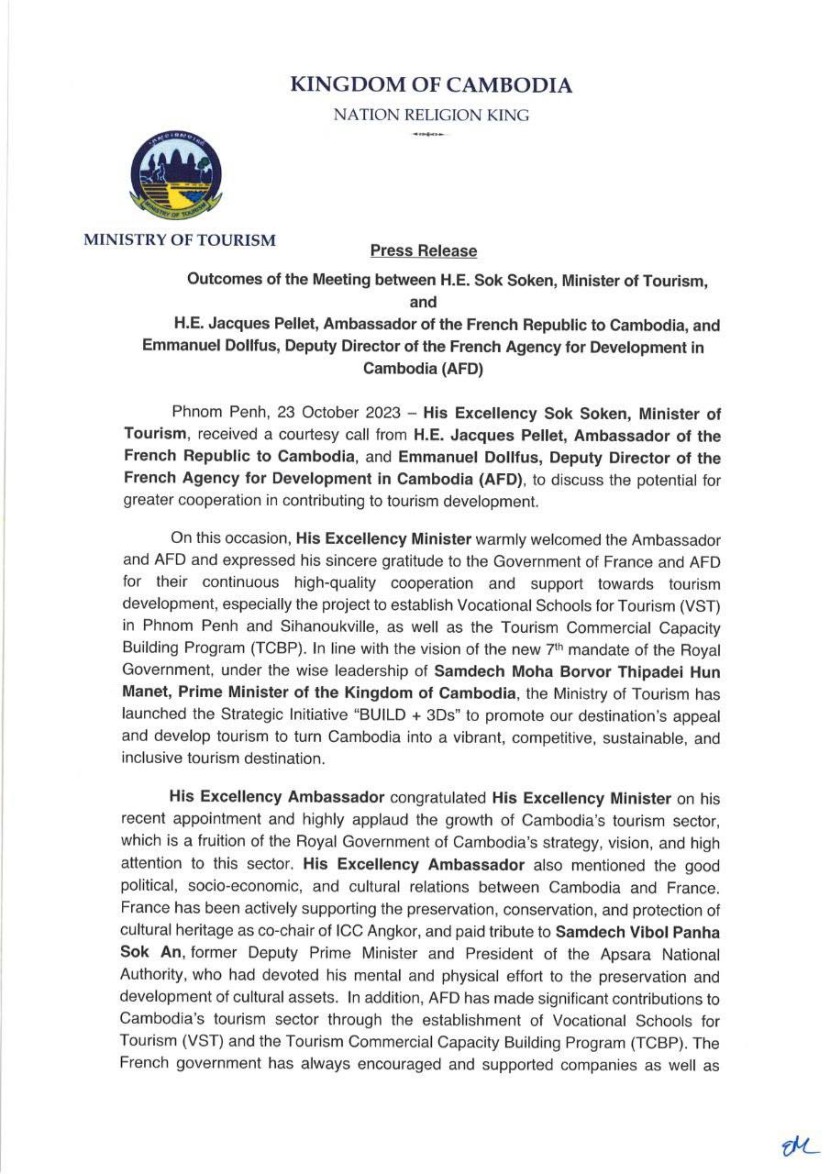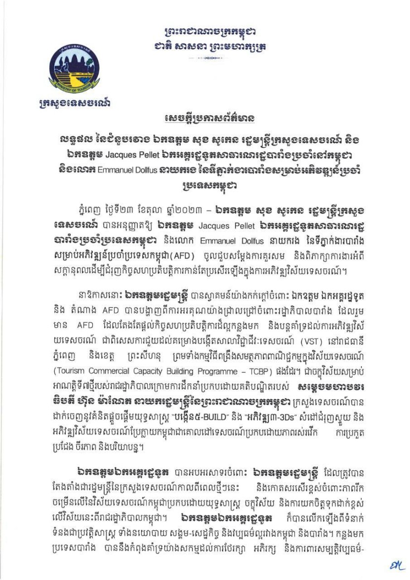 សេចក្តីប្រកាសព័ត៌មាន លទ្ធផលនៃជំនួបរវាង ឯកឧត្តម សុខ សូកេន រដ្ឋមន្ត្រីក្រសួងទេសចរណ៍ និង ឯកឧត្តម Jacques Pellet ឯកអគ្គរដ្ឋទូតសាធារណរដ្ឋបារាំង ប្រចាំនៅកម្ពុជា និងលោក Emmanuel Dollfus នាយករងនៃទីភ្នាក់ងារបារាំងសម្រាប់អភិវឌ្ឍន៍ប្រចាំប្រទេសកម្ពុជា
