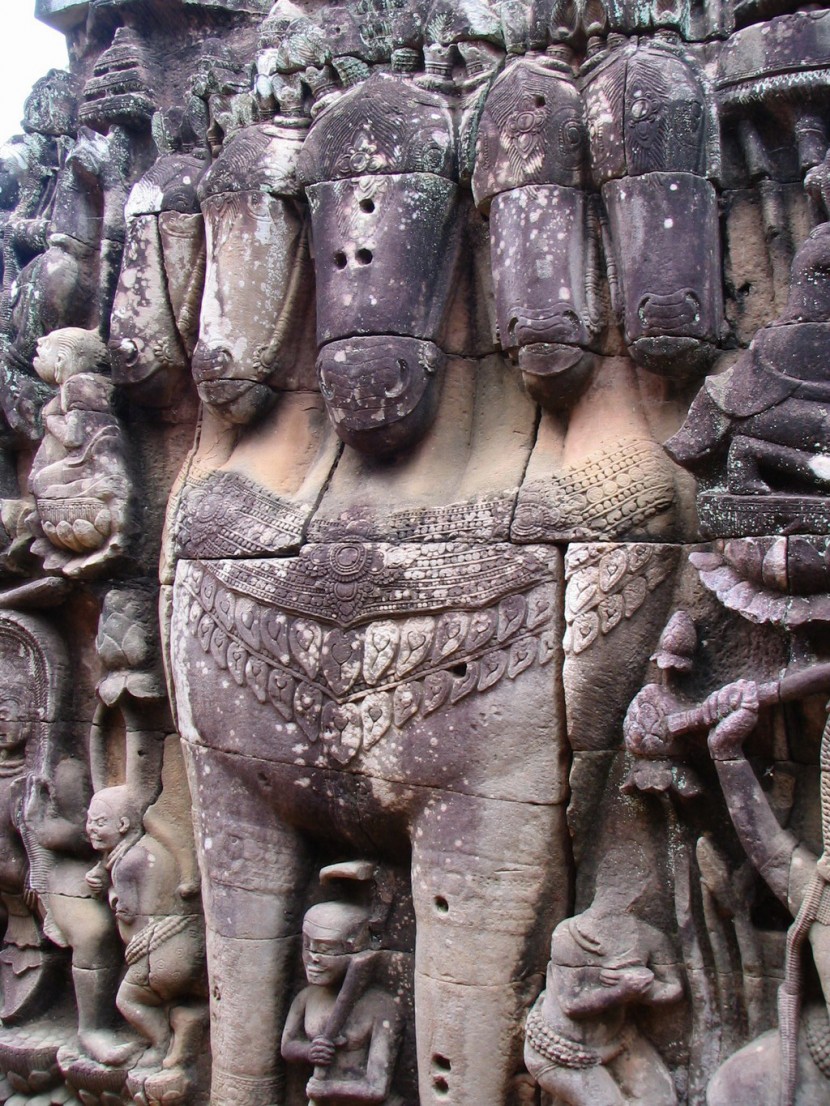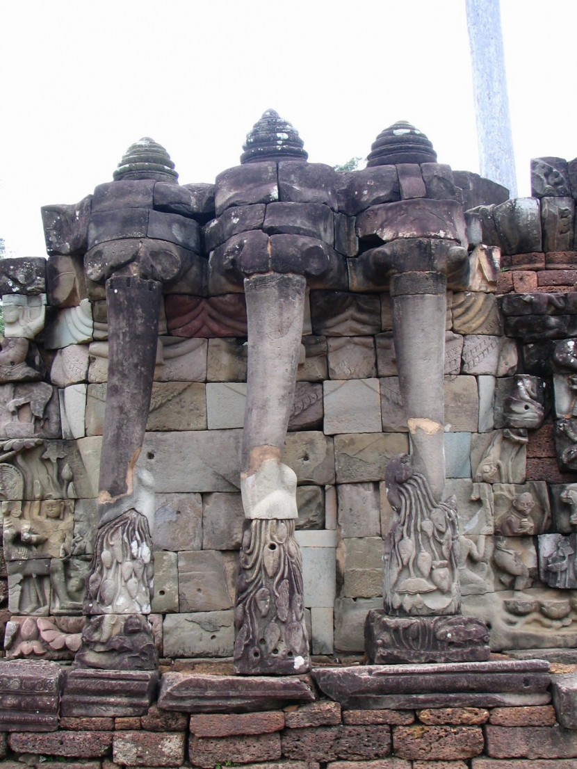 The Terrace of the Elephants is part of the walled city of Angkor Thom. The terrace was used by king Jayavarman VII as a platform from which to view his victorious returning army. It was attached to the palace of Phimeanakas. Most of the original structure was made of organic material and has long since disappeared and most of what remains are the foundation platforms of the complex. The terrace is named for the carvings of elephants on its eastern side.
