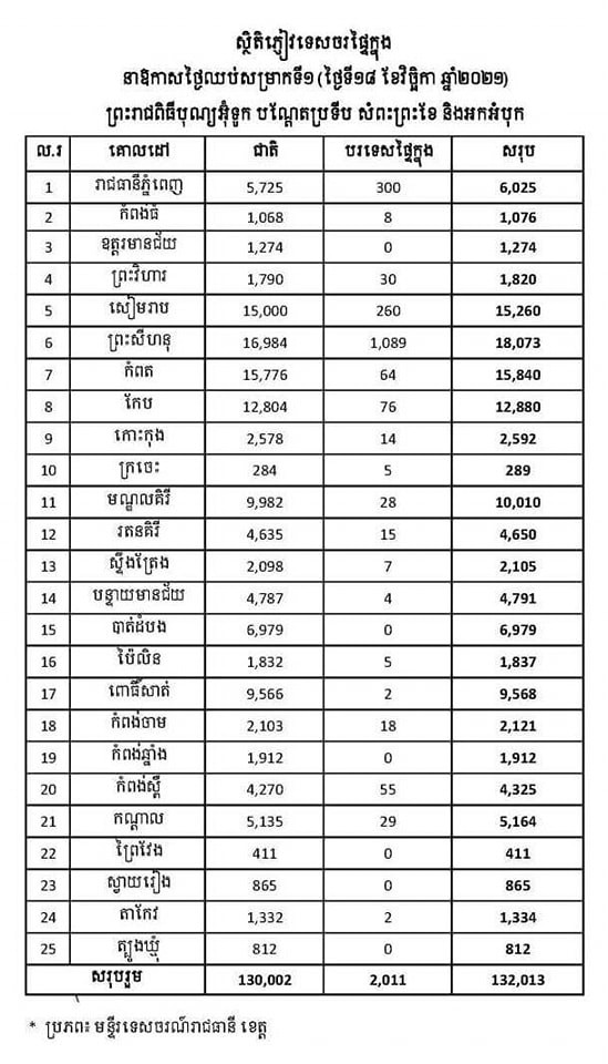 (ភ្នំពេញ)៖ ក្នុងនាឱកាសថ្ងៃឈប់សម្រាកទី១ នៃព្រះរាជពិធីបុណ្យអុំទូក បណ្តែតប្រទីប និងសំពះព្រះខែ អកអំបុក ដែលត្រូវនឹងថ្ងៃទី១៨ ខែវិច្ឆិកា ឆ្នាំ២០២១នេះ នៅទូទាំងប្រទេសកម្ពុជាមានភ្ញៀវទេសចរចេញដើរលេងកម្សាន្តសរុប១៣២,០១៣នាក់ ក្នុងនោះមានភ្ញៀវជាតិ១៣០,០០២នាក់ និងភ្ញៀវបរទេសផ្ទៃក្នុង២,០១១នាក់។ នេះបើតាមឯកឧត្ដម ថោង ខុន រដ្ឋមន្ត្រីក្រសួងទេសចរណ៍ ដែលបានបញ្ជាក់មកកាន់បណ្ដាញព័ត៌មាន Fresh News នៅយប់ថ្ងៃទី១៨ ខែវិច្ឆិកានេះ។
