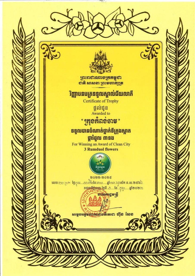 គណៈកម្មាធិការជាតិវាយតម្លៃទីក្រុងស្អាតសូមអបអរសាទរជ័យលាភី "ក្រុងកំពង់ចាម” នៃខេត្តកំពង់ចាម ដែលទទួលបានចំណាត់ថ្នាក់ទីក្រុងស្អាតផ្ការំដួល ៣ទង នាឱកាសពិធីប្រគល់ជ័យលាភីទីក្រុងស្អាតលើកទី៣ សុពលភាព ឆ្នាំ២០២២-២០២៥ ដែលបានប្រព្រឹត្តទៅក្រោមអធិបតីភាពដ៏ខ្ពង់ខ្ពស់បំផុតរបស់ សម្តេចអគ្គមហាសេនាបតីតេជោ ហ៊ុន សែន នាយករដ្ឋមន្ត្រី នៃព្រះរាជាណាចក្រកម្ពុជា កាលពីរសៀលថ្ងៃទី២៧ ខែកុម្ភៈ ឆ្នាំ២០២៣។
