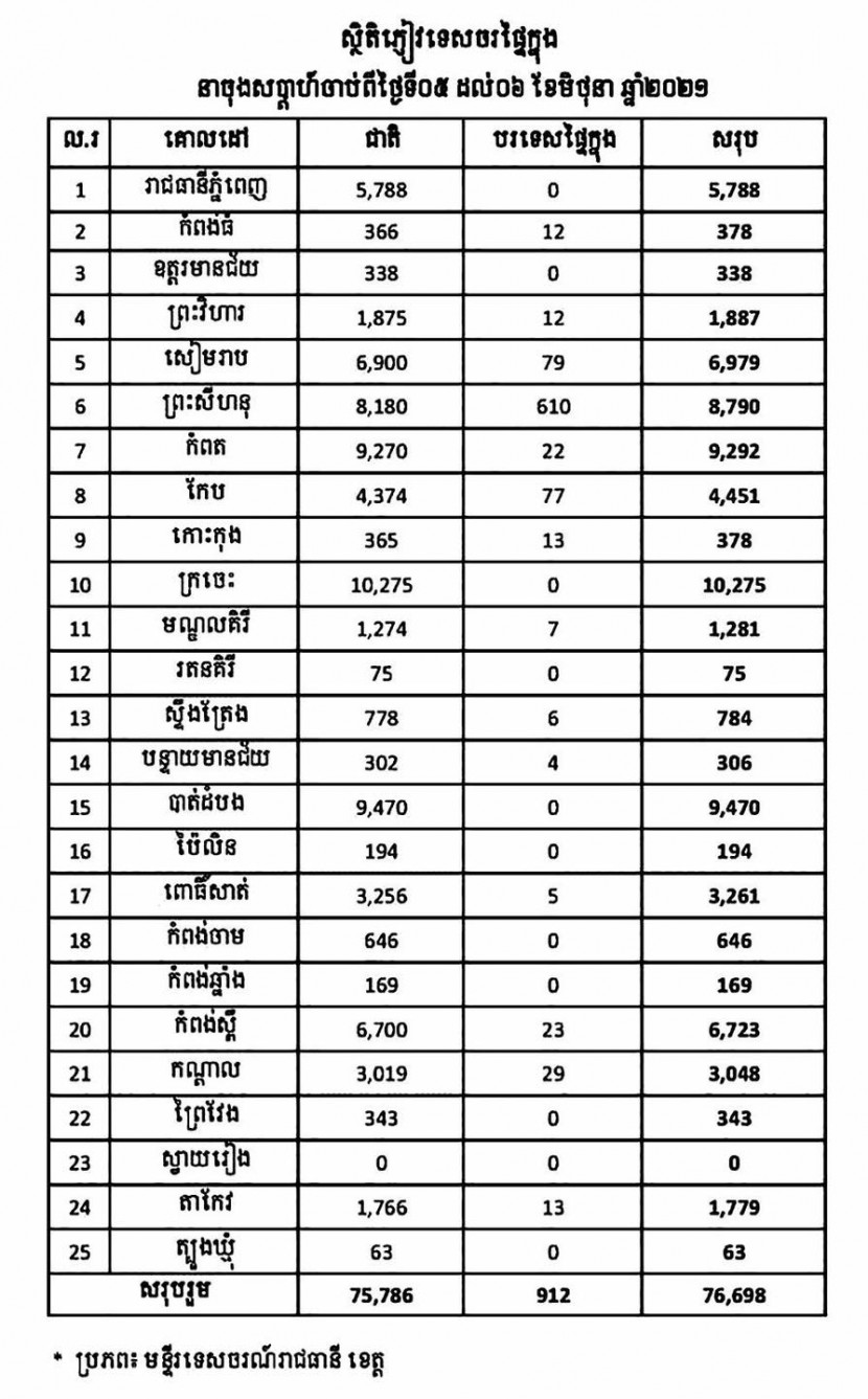 (ភ្នំពេញ)៖ ឯកឧត្តម ថោង ខុន រដ្ឋមន្ត្រីក្រសួងទេសចរណ៍ នាថ្ងៃទី០៧ ខែមិថុនា ឆ្នាំ២០២១នេះ បានបញ្ជាក់ប្រាប់ថា រយៈពេល២ថ្ងៃ ចាប់ពីថ្ងៃ០៥-០៦ ខែមិថុនា នៅទូទាំងប្រទេសកម្ពុជាទទួលបានភ្ញៀវទេសចរសរុប ៧៦,៦៩៨ នាក់ ក្នុងនោះភ្ញៀវជាតិ ៧៥,៧៨៦ នាក់ និងភ្ញៀវបរទេសផ្ទៃក្នុង ៩១២ នាក់។