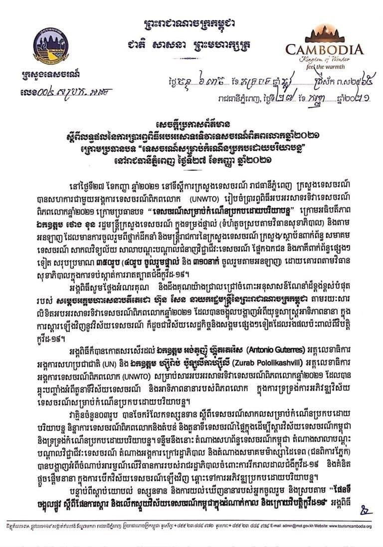 (ភ្នំពេញ)៖ ក្រសួងទេសចរណ៍ សហការជាមួយអង្គការទេសចរណ៍ពិភពលោក (UNWTO) នាថ្ងៃទី២៧ ខែកញ្ញា ឆ្នាំ២០២១នេះ បានរៀបចំប្រារព្ធពិធីអបអរសាទរទិវាទេសចរណ៍ពិភពលោកឆ្នាំ២០២១ ក្រោមប្រធានបទ «ទេសចរណ៍សម្រាប់កំណើនប្រកបដោយបរិយាបន្ន» ហើយនារសៀលថ្ងៃនេះដែរ ក្រសួងក៏បានសេចក្តីប្រកាសព័ត៌មានស្ដីពីលទ្ធផលព្រឹត្តិការណ៍នេះ។
