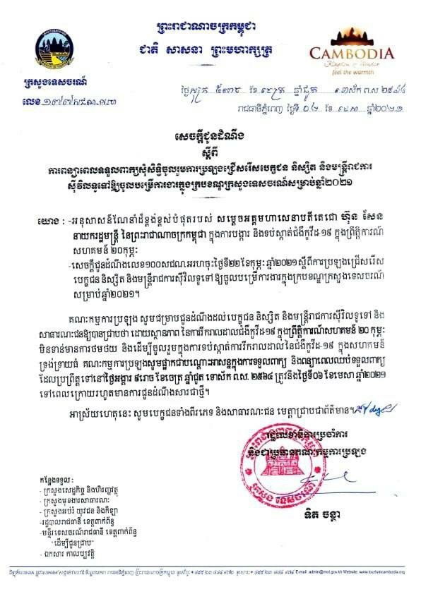 ក្រសួងទេសចរណ៍ចេញសេចក្តីជូនដំណឹង ស្តីពីការពន្យាពេលទទួលពាក្យសុំសិទ្ធិចូលរួមការប្រឡងជ្រើសរើសបេក្ខជន និស្សិត និងមន្រ្តីរាជការស៊ីវិលទូទៅឱ្យចូលបម្រើការងារក្នុងក្របខណ្ឌក្រសួងទេសចរណ៍សម្រាប់ឆ្នាំ២០២១
