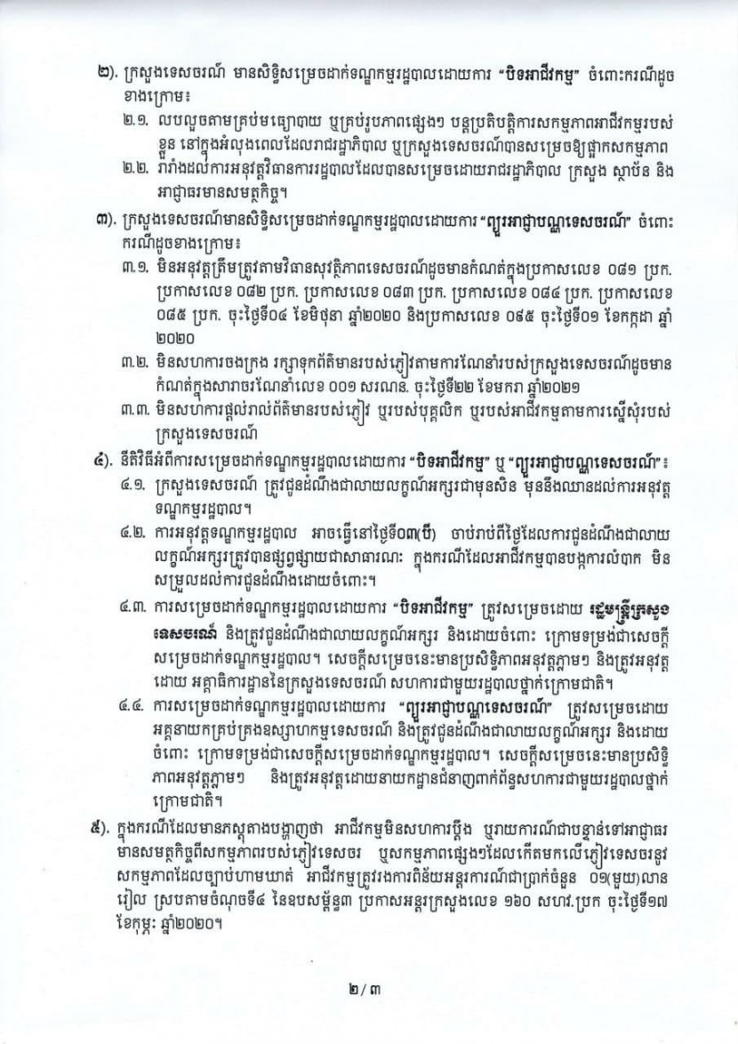 ក្រសួងទេសចរណ៍ កំណត់លក្ខខណ្ឌបិទអាជីវកម្ម ឬព្យួរអាជ្ញាបណ្ណទេសចរណ៍ចំពោះអាជីវកម្មទេសចរណ៍ដែលល្មើសច្បាប់ស្ដីពីវិធានការទប់ស្កាត់ជំងឺកូវីដ