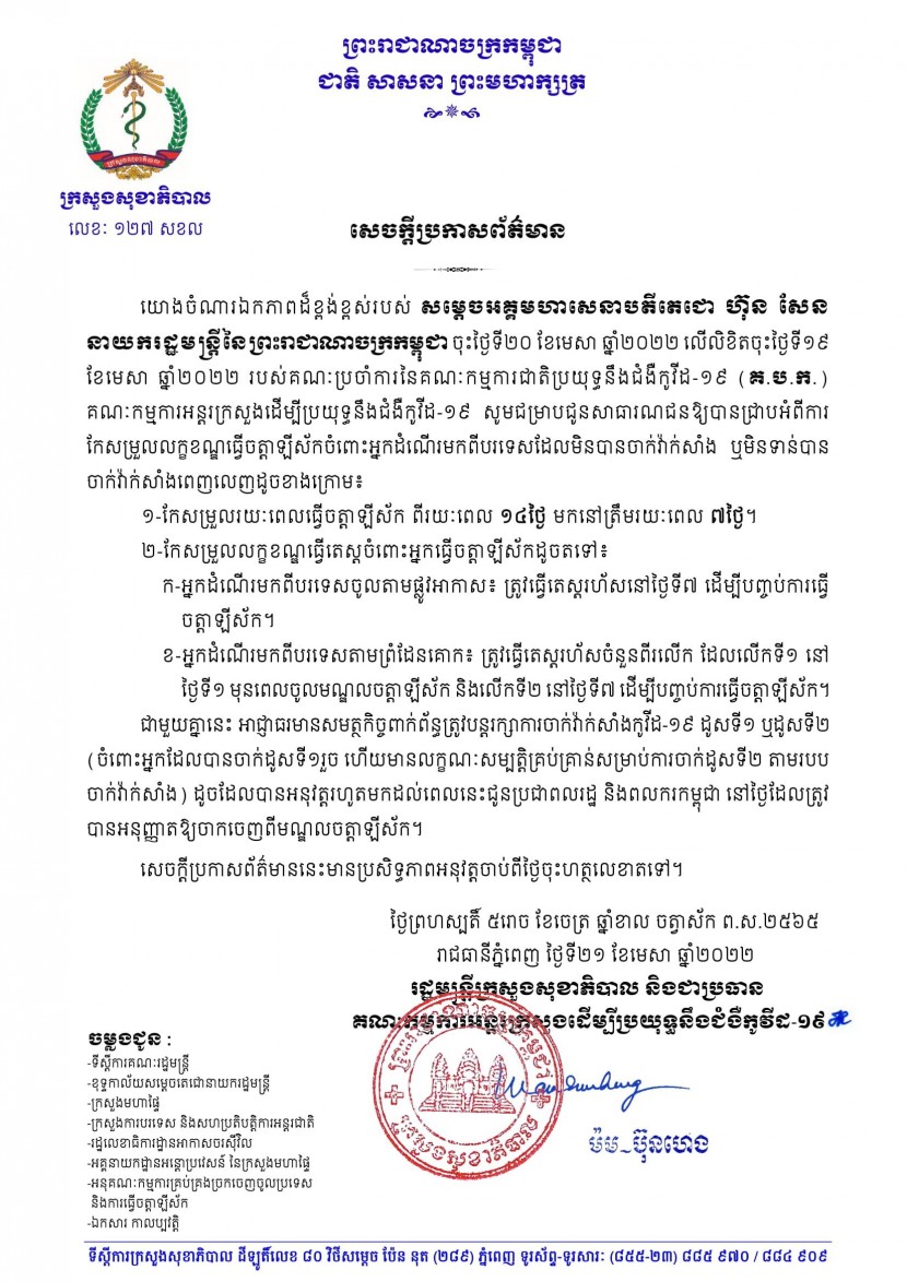 (ភ្នំពេញ)៖ ក្រសួងសុខាភិបាល បានចេញសេចក្តីប្រកាសព័ត៌មានផ្លូវការមួយ ស្តីពីការសម្រេចរបស់រាជរដ្ឋាភិបាលកែសម្រួលលក្ខខណ្ឌធ្វើចត្តាឡីស័ក សម្រាប់អ្នកដំណើរបរទេស ដែលមិនទាន់បានចាក់វ៉ាក់សាំង ហើយចូលមកកម្ពុជា ដោយបន្ថយថ្ងៃធ្វើចត្តាឡីស័កពី១៤ថ្ងៃ មកត្រឹមតែ៧ថ្ងៃប៉ុណ្ណោះ។ នេះបើតាមលិខិតរបស់លោក ម៉ម ប៊ុនហេង រដ្ឋមន្ត្រីក្រសួងសុខាភិបាល ដែលបណ្តាញព័ត៌មាន Fresh News ទទួលបាននៅព្រឹកថ្ងៃទី២១ ខែមេសានេះ។