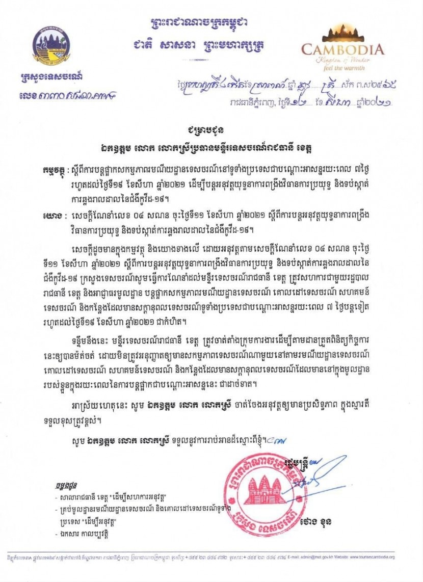 ក្រសួងទេសចរណ៍ជូនដំណឹងដល់មន្ទីរទេសចរណ៍រាជធានី-ខេត្ត ស្តីពីការបន្តបិទរមណីយដ្ឋាន និងគោលដៅទេសចរណ៍ទូទាំងប្រទេស រយៈពេល ៧ថ្ងៃបន្តទៀត រហូតដល់ថ្ងៃទី១៩ ខែសីហា ឆ្នាំ២០២១ ស្របតាមខ្លឹមសារសេចក្តីណែនាំលេខ ០៤ ចុះថ្ងៃទី១១ ខែសីហា ឆ្នាំ២០២១ ស្តីពីការបន្តអនុវត្តយុទ្ធនាការពង្រឹងវិធានការប្រយុទ្ធ និងទប់ស្កាត់ការឆ្លងរាលដាលនៃជំងឺកូវីដ-១៩