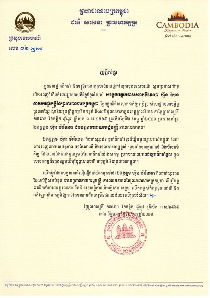 ថ្នាក់ដឹកនាំ និងមន្ត្រីរាជការក្រសួងទេសចរណ៍ សូមប្រកាសគាំទ្រយ៉ាងពេញទំហឹងចំពោះប្រសាសន៍របស់សម្តេចតេជោ ហ៊ុន សែន ប្រកាសគាំទ្រ ឯកឧត្តម ហ៊ុន ម៉ាណែត ជាបេក្ខភាពនាយករដ្ឋមន្រ្តី នាពេលអនាគត។