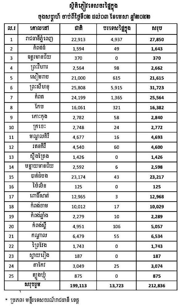 (ភ្នំពេញ)៖ ឯកឧត្ដម ថោង ខុន រដ្ឋមន្ត្រីក្រសួងទេសចរណ៍ នាថ្ងៃទី០៤ ខែមេសា ឆ្នាំ២០២២នេះ បានឱ្យដឹងថា នាថ្ងៃចុងសប្ដាហ៍ថ្ងៃទី០២-០៣ ខែមេសា ឆ្នាំ២០២២ នៅទូទាំងប្រទេសកម្ពុជា ទទួលបានភ្ញៀវសរុបមានចំនួន ២១២,៨៣៦នាក់ ក្នុងនោះភ្ញៀវជាតិ ១៩៩,១១៣នាក់ និងភ្ញៀវបរទេសផ្ទៃក្នុង ១៣,៧២៣នាក់។