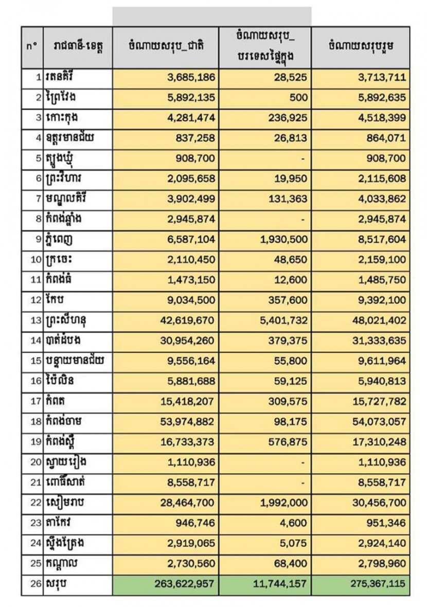 ទន្ទឹមនេះ លោក ថោង ខុន បានបន្តថា ក៏សង្កេតឃើញខេត្តដែលមានទេសចរចំណាយច្រើនជាងគេ គឺខេត្តកំពង់ចាម (៥៤លានដុល្លារ), ខេត្តព្រះសីហនុ (៤៨លានដុល្លារ), ខេត្តបាត់ដំបង (៣១លានដុល្លារ), ខេត្តសៀមរាប (៣០លានដុល្លារ)។