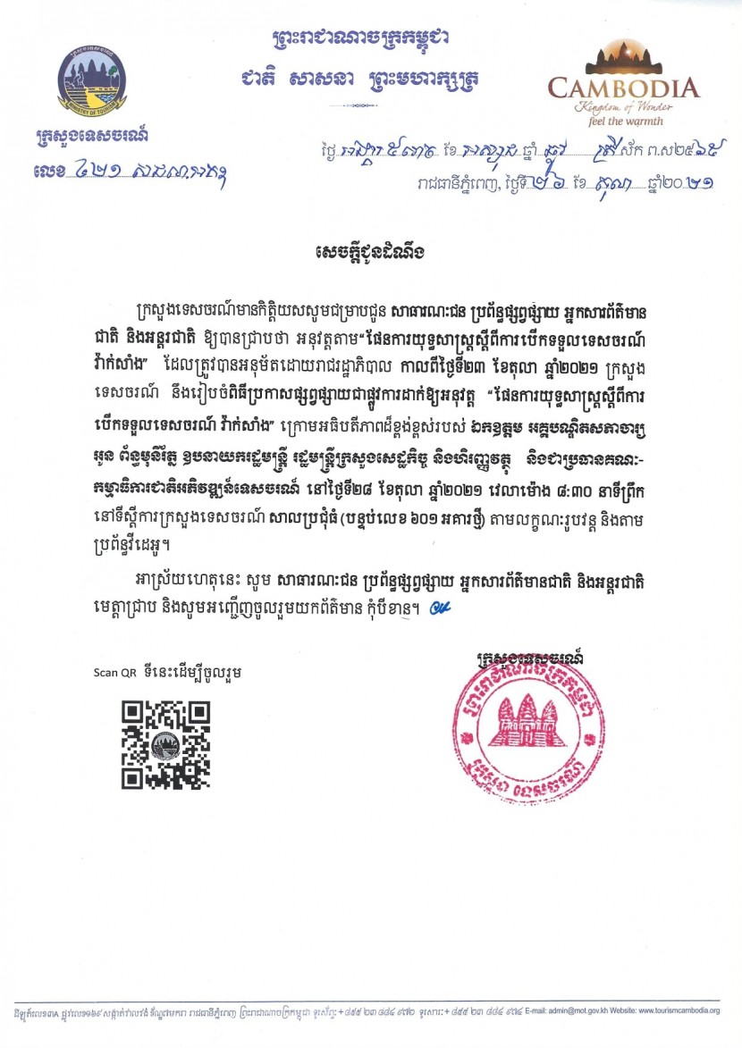 (ភ្នំពេញ)៖ ក្រសួងទេសចរណ៍នឹងរៀបចំពិធីប្រកាសផ្សព្វផ្សាយជាផ្លូវការនូវការដាក់ឱ្យអនុវត្ត «ផែនការយុទ្ធសាស្ត្រស្ដីពីការបើកទទួលទេសចរណ៍វ៉ាក់សាំង» និង «វិធានការគោលនយោបាយជំរុញចលនាទេសចរណ៍ផ្ទៃក្នុង ឆ្នាំ២០២១-២០២៣» នាថ្ងៃទី២៨ ខែតុលា ឆ្នាំ២០២១ ខាងមុខនេះ ក្នុងនោះក៏មានការរៀបចំសន្និសីទសារព័ត៌មានជាមួយក្រុមអ្នកសារព័ត៌មានផងដែរ។