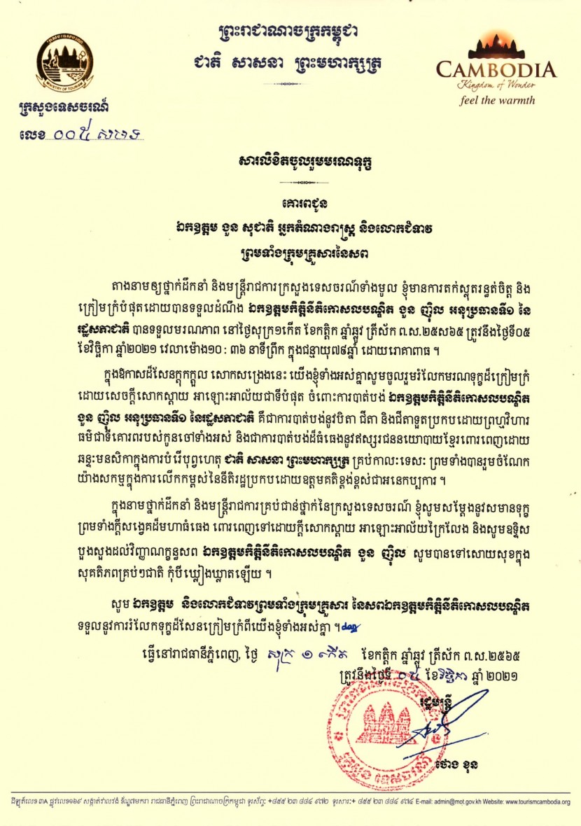 ក្នុងឱកាសដ៏សែនក្ដុកក្ដួល សោកសង្រេងនេះ ថ្នាក់ដឹកនាំ និងមន្រ្តីរាជការក្រសួងទេសចរណ៍សូមចូលរួមរំលែកមរណទុក្ខដ៏ក្រៀមក្រំ ដោយសេចក្ដីសោកស្តាយ អាឡោះអាល័យជាទីបំផុត ចំពោះការបាត់បង់ ឯកឧត្តមកិត្តិនីតិកោសលបណ្ឌិត ងួន ញ៉ិល អនុប្រធានទី១ នៃរដ្ឋសភាជាតិ គឺជាការបាត់បង់នូវបិតា ជីតា និងជីតាទួតប្រកបដោយព្រហ្មវិហារធម៌ជាទីគោរពរបស់កូនចៅទាំងអស់ និងជាការបាត់បង់ដ៏ធំធេងនូវឥស្សរជននយោបាយខ្មែរពោរពេញដោយឆន្ទៈមនសិកាក្នុងការបំរើបុព្វហេតុ ជាតិ សាសនា ព្រះមហាក្សត្រ គ្រប់កាលៈទេសៈ ព្រមទាំងបានរួមចំណែកយ៉ាងសកម្មក្នុងការលើកកម្ពស់នៃនីតិរដ្ឋប្រកប ដោយឧត្តម គតិខ្ពង់ខ្ពស់ជាអនេកប្បការ ។