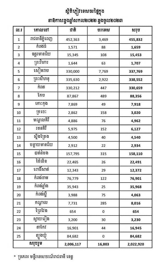 (ភ្នំពេញ)៖ នៅទូទាំងប្រទេសទទួលបានភ្ញៀវសរុបប្រមាណ២,០២២,៩២០នាក់ ក្នុងនោះភ្ញៀវជាតិ២,០០៦,១១៧នាក់ និងភ្ញៀវបរទេស១៦,៨០៣នាក់។