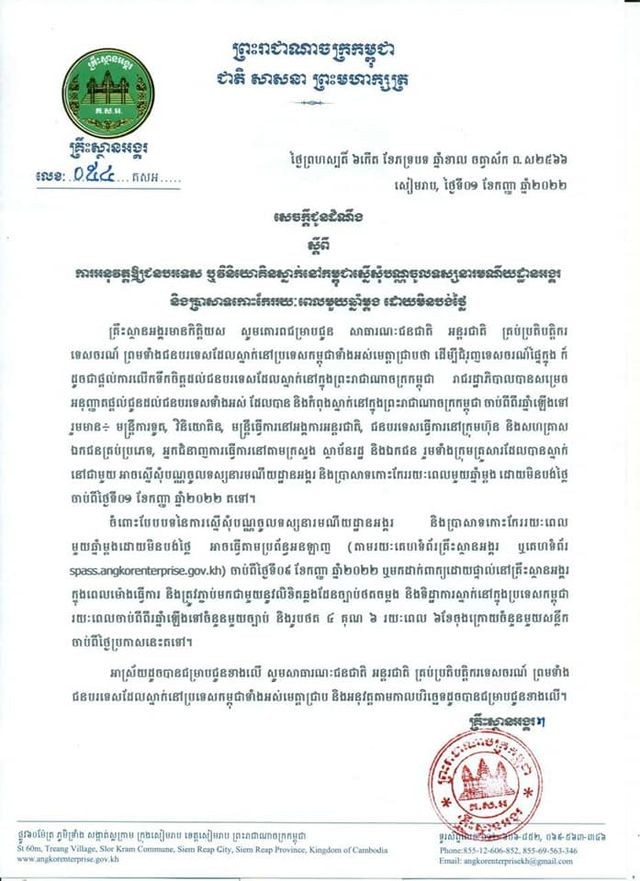 សេចក្ដីជូនដំណឹងដដែលនេះ បានបញ្ជាក់ថា ដើម្បីជំរុញទេសចរណ៍ផ្ទៃក្នុង ក៏ដូចជាផ្តល់ការលើកទឹកចិត្តដល់ជនបរទេសដែលស្នាក់នៅក្នុងកម្ពុជា រាជរដ្ឋាភិបាលបានសម្រេចអនុញ្ញាតផ្តល់ជូនដល់ជនបរទេសទាំងអស់ ដែលបាននិងកំពុងស្នាក់នៅក្នុងព្រះរាជាណាចក្រកម្ពុជា ចាប់ពីពីរឆ្នាំឡើងទៅ រួមមាន មន្ត្រីការទូត, វិនិយោគិន, មន្ត្រីធ្វើការនៅអង្គការអន្តរជាតិ, ជនបរទេសធ្វើការនៅក្រុមហ៊ុន និងសហគ្រាសឯកជនគ្រប់ប្រភេទ, អ្នកជំនាញការធ្វើការនៅតាមក្រសួង ស្ថាប័នរដ្ឋ និងឯកជន រួមទាំងក្រុមគ្រួសារដែលបានស្នាក់នៅជាមួយ អាចស្នើសុំបណ្ណចូលទស្សនារមណីយដ្ឋានអង្គរ និងប្រាសាទកោះកែររយៈពេលមួយឆ្នាំម្តង ដោយមិនបង់ថ្លៃចាប់ពីថ្ងៃទី០១ ខែកញ្ញា ឆ្នាំ២០២២ តទៅ។