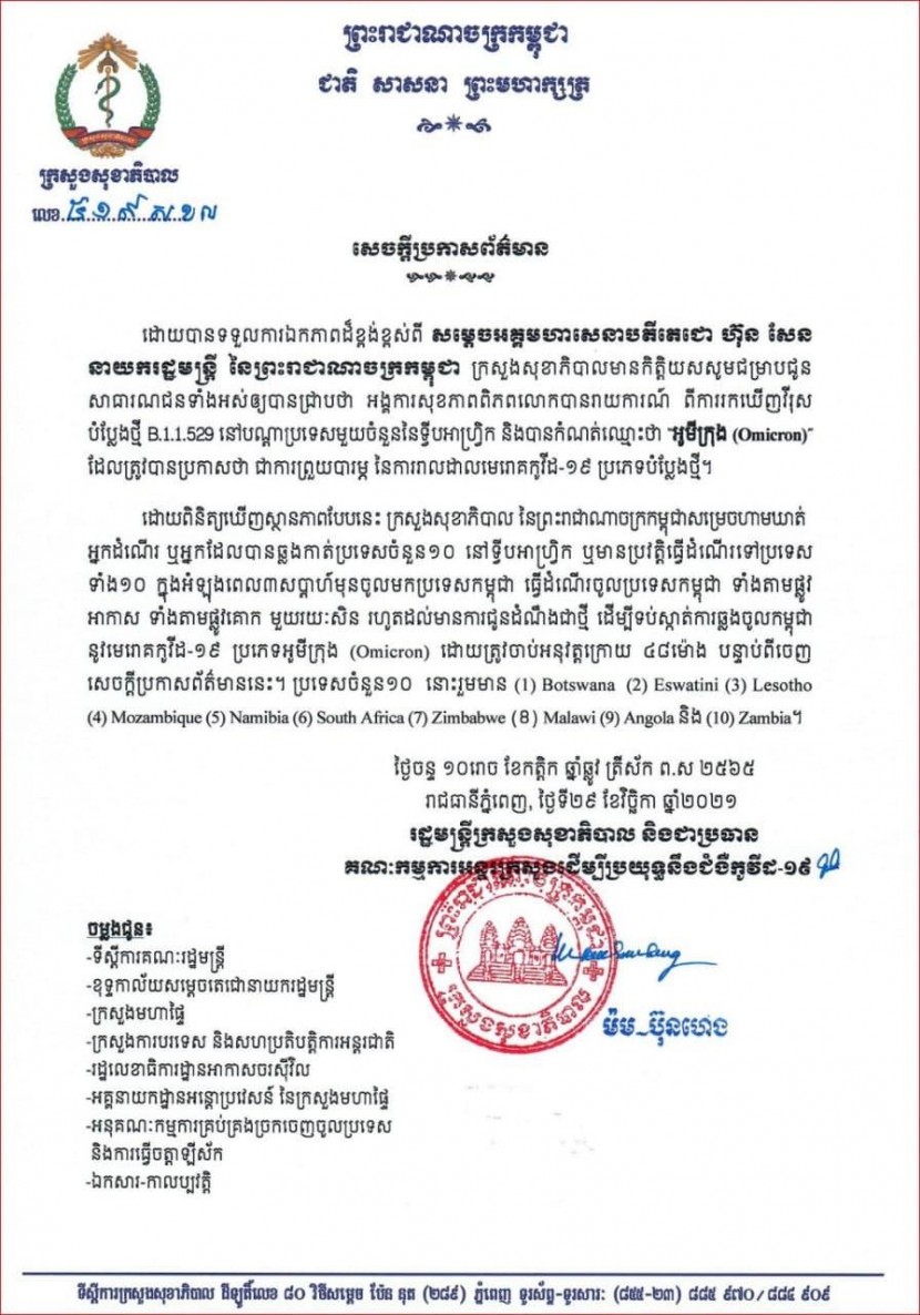 សេចក្តីជូនដំណឹងរបស់ក្រសួងសុខាភិបាល បានបញ្ជាក់ឲ្យដឹងថា ដោយបានទទួលការឯកភាពដ៏ខ្ពង់ខ្ពស់ពីសម្តេចអគ្គមហាសេនាបតីតេជោ ហ៊ុន សែន នាយករដ្ឋមន្ត្រីនៃព្រះរាជាណាចក្រកម្ពុជា ក្រសួងសុខាភិបាលមានកិត្តិយសសូមជម្រាបជូនសាធារណជនទាំងអស់ឲ្យបានជ្រាបថា អង្គការសុខភាពពិភពលោកបានរាយការណ៍ ពីការរកឃើញវីរុសបំប្លែងថ្មី B.1.1.529 នៅបណ្តាប្រទេសមួយចំនួននៃទ្វីបអាហ្វ្រិក និងបានកំណត់ឈ្មោះថា អូមីក្រុង (Omicron) ដែលត្រូវបានប្រកាសថា ជាការព្រួយបារម្ភ នៃការរាលដាលមេរោគកូវីដ-១៩ ប្រភេទបំប្លែងថ្មី។