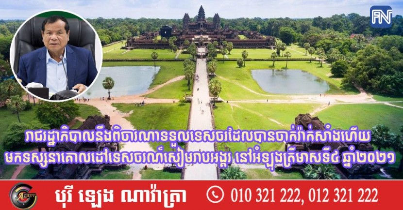 (ភ្នំពេញ)៖ រាជរដ្ឋាភិបាលកម្ពុជា នឹងពិចារណាក្នុងការបើកទទួលភ្ញៀវទេសចរអន្តរជាតិដែលបានចាក់វ៉ាក់សាំងបង្ការជំងឺកូវីដ១៩ហើយ មកទស្សនាគោលដៅទេសចរណ៍សៀមរាប-អង្គរ នៅត្រីមាសទី៤ នៃឆ្នាំ២០២១ ស្របពេលដែលការគ្រប់គ្រងសហគមន៍នៅខេត្តសៀមរាប-អង្គរស្ថិតក្នុងភាពល្អប្រសើរ។ នេះបើតាមលោក ថោង ខុន រដ្ឋមន្ត្រីក្រសួងទេសចរណ៍ ដែលបានបញ្ជាក់ប្រាប់ Fresh News នាថ្ងៃទី០៧ ខែមេសា ឆ្នាំ២០២១នេះ។