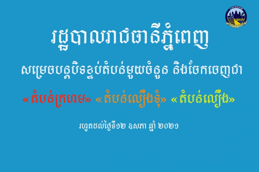 ទីបំផុតរដ្ឋបាលរាជធានីភ្នំពេញ សម្រេចបន្តបិទខ្ទប់តំបន់មួយចំនួន និងចែកចេញជា «តំបន់ក្រហម» «តំបន់លឿងទុំ» «តំបន់លឿង» ក្នុងភូមិសាស្រ្តរាជធានីភ្នំពេញ ប៉ុន្តែបង្រួមតំបន់បិទខ្ទប់មកតូចវិញ