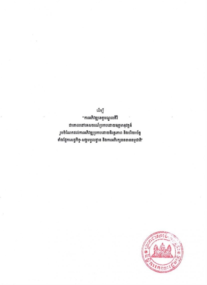 និងទី៤-ការធានាបាននូវសន្តិសុខ សុវត្ថិភាព និងសណ្តាប់ធ្នាប់សង្គមក្នុងខេត្តមណ្ឌលគិរី ដែលជាកត្តាធានាបាននូវទំនុកចិត្តជូនភ្ញៀវទេសចរ និងអ្នកវិនិយោគ។
