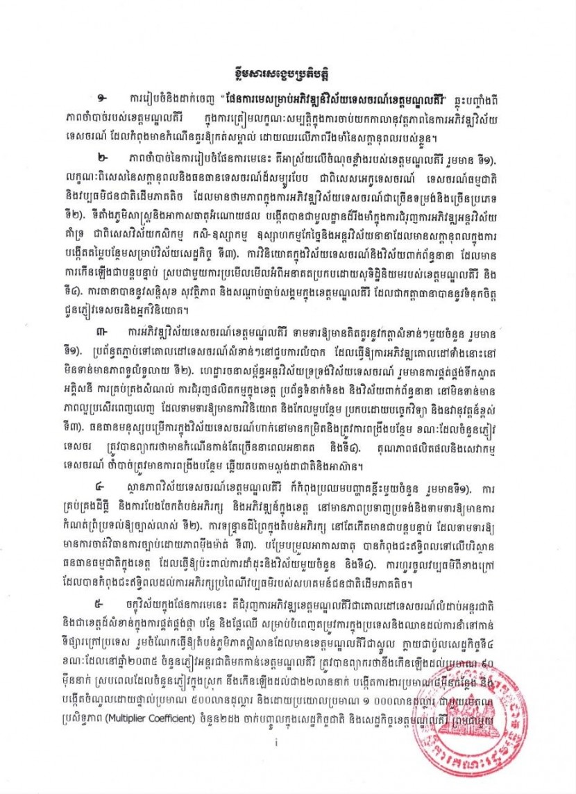 ១៖ ការរៀបចំនិងដាក់ចេញ «ផែនការមេសម្រាប់អភិវឌ្ឍន៍ វិស័យទេសចរណ៍ខេត្តមណ្ឌលគិរី» គឺឆ្លុះបញ្ចាំងពីភាពចាំបាច់របស់ខេត្តមណ្ឌលគិរី ក្នុងការត្រៀមលក្ខណៈសម្បត្តិ ក្នុងការចាប់យកកាលានុវត្តភាពនៃការអភិវឌ្ឍវិស័យទេសចរណ៍ ដែលកំពុងមានកំណើនគួរឱ្យកត់សម្គាល់ ដោយឈរលើភាពរឹងមាំនៃសក្តានុពលរបស់ខ្លួន។