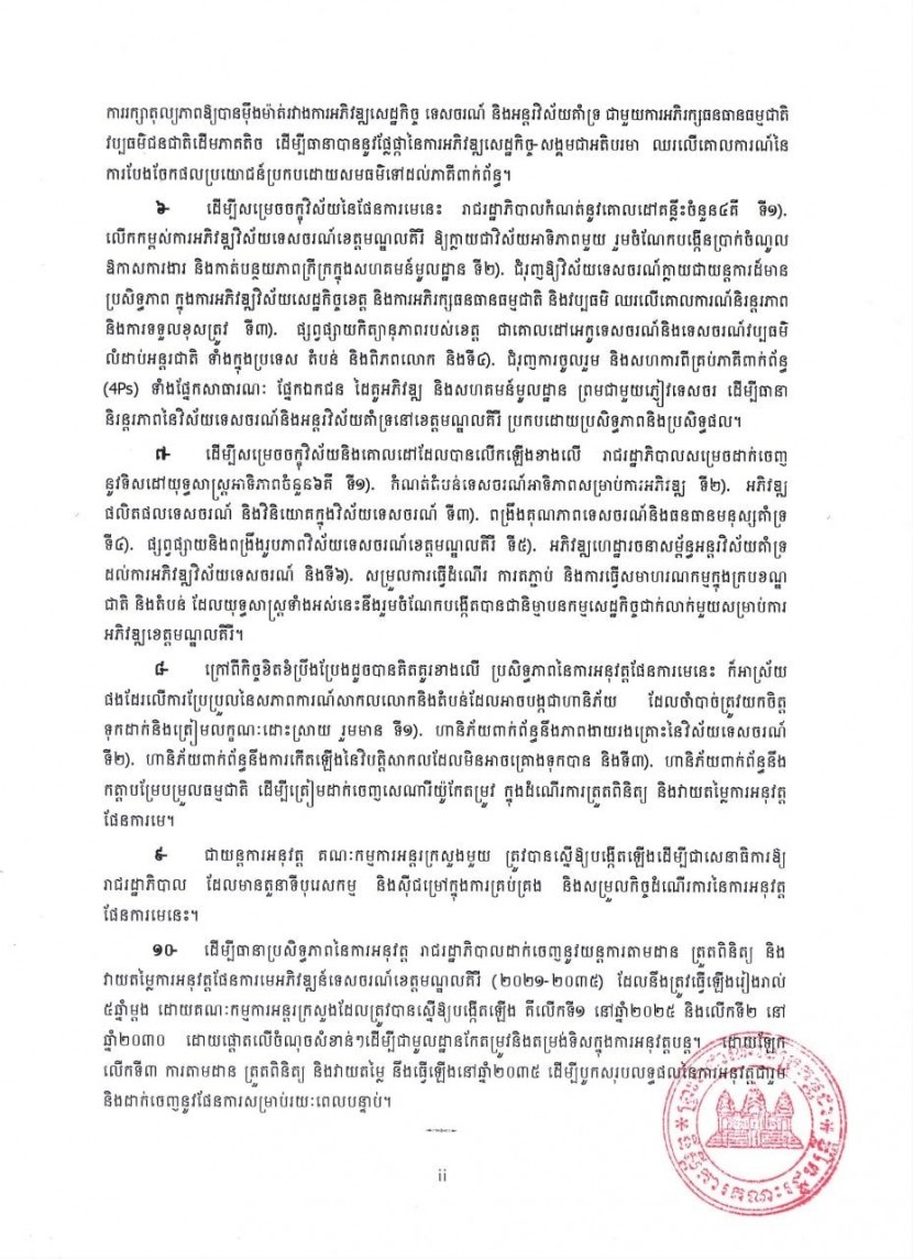 ៦៖ ដើម្បីសម្រេចចក្ខុវិស័យនៃផែនការមេនេះ រាជរដ្ឋាភិបាលកំណត់នូវគោលដៅគន្លឹះចំនួន ៤ គឺ៖ ទី១-លើកកម្ពស់ការអភិវឌ្ឍវិស័យទេសចរណ៍ ខេត្តមណ្ឌលគិរី ឱ្យក្លាយជាវិស័យអាទិភាពមួយ រួមចំណែកបង្កើនប្រាក់ចំណូល ឱកាសការងារ និងកាត់បន្ថយភាពក្រីក្រក្នុងសហគមន៍មូលដ្ឋាន, ទី២- ជំរុញឱ្យវិស័យទេសចរណ៍ ក្លាយជាយន្តការដ៏មានប្រសិទ្ធភាព ក្នុងការអភិវឌ្ឍវិស័យសេដ្ឋកិច្ចខេត្ត និងការអភិរក្សធនធានធម្មជាតិ និងវប្បធម៌ ឈរលើគោលការណ៍និរន្តរភាព និងការទទួលខុសត្រូវ, ទី៣- ផ្សព្វផ្សាយកិត្យានុភាពរបស់ខេត្ត ជាគោលដៅអេកូទេសចរណ៍ និងទេសចរណ៍វប្បធម៌លំដាប់អន្តរជាតិ ទាំងក្នុងប្រទេស តំបន់ និងពិភពលោក, និងទី៤-ជំរុញការចូលរួម និងសហការពីគ្រប់ភាគីពាក់ព័ន្ធ (4Ps) ទាំងផ្នែកសាធារណៈ ផ្នែកឯកជន ដៃគូអភិវឌ្ឍ និងសហគមន៍មូលដ្ឋាន ព្រមជាមួយភ្ញៀវទេសចរ ដើម្បីធានានិរន្តរភាពនៃវិស័យទេសចរណ៍ និងអន្តរវិស័យគាំទ្រនៅខេត្តមណ្ឌលគិរី ប្រកបដោយប្រសិទ្ធភាព និងប្រសិទ្ធផល។