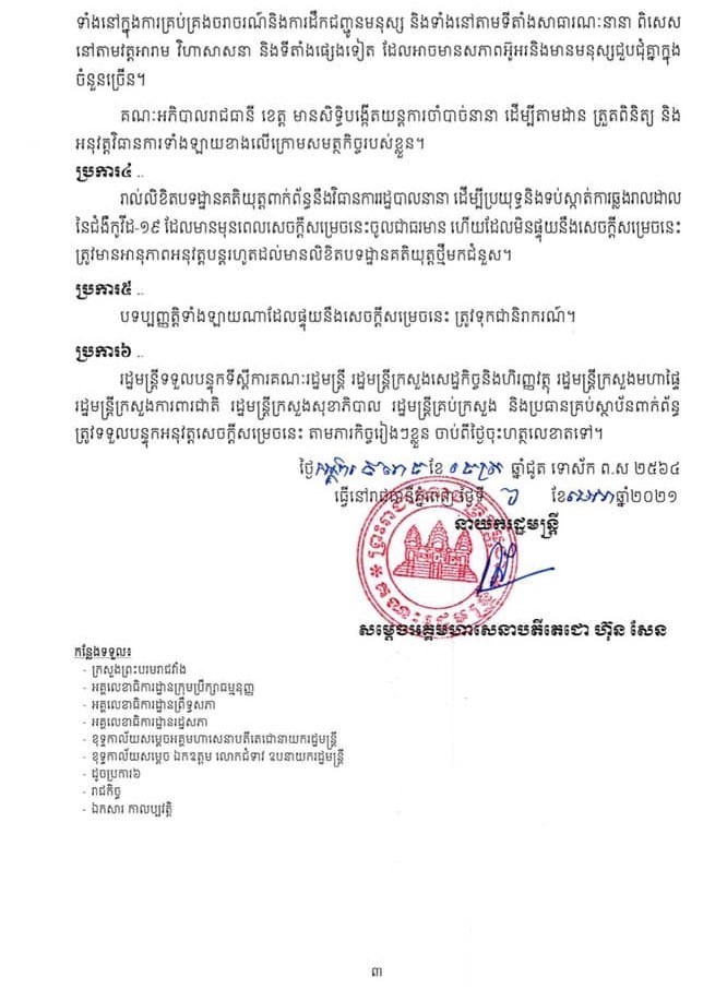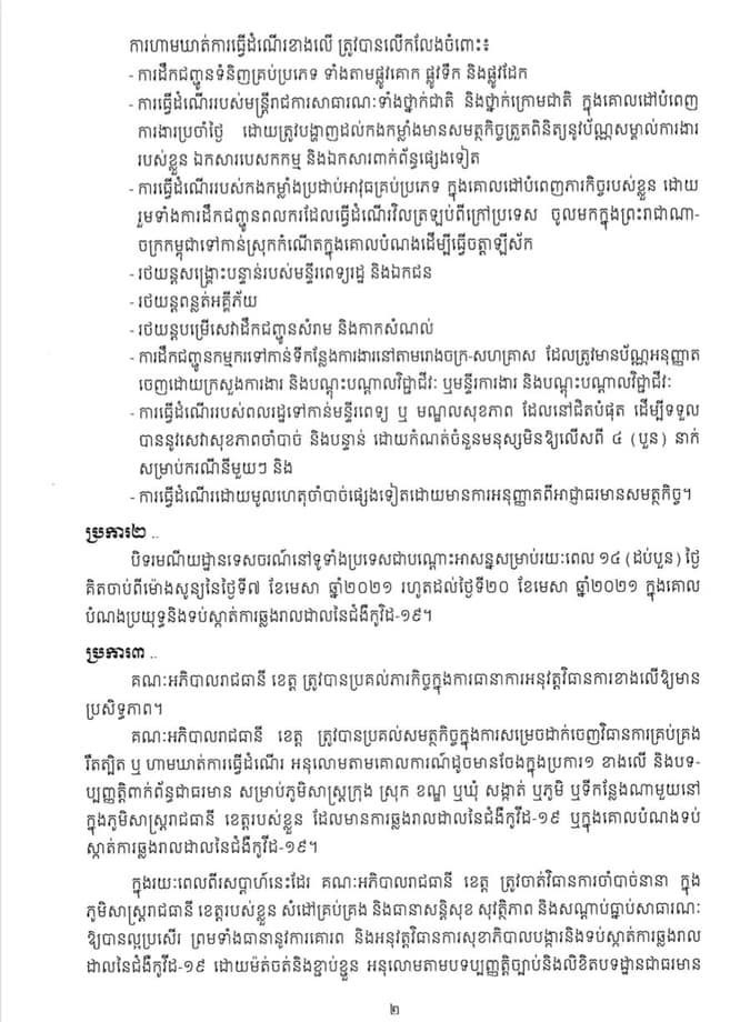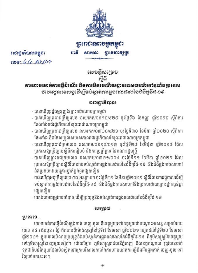 សេចក្ដីសម្រេចរបស់រាជរដ្ឋាភិបាល ស្ដីពី ការហាមឃាត់ ការធ្វើដំណើរ និងការបិទរមនីយដ្ឋានទេសចរណ៍ទូទាំងប្រទេស ជាបណ្ដោះអាសន្នដើម្បីទប់ស្កាត់ ការឆ្លងរាលដាលនៃជម្ងឺកូវីដ១៩ រយៈពេល១៤ថ្ងៃ ចាប់ពីថ្ងៃទី៧ ដល់ថ្ងៃទី២០ ខែមេសា ឆ្នាំ២០២១