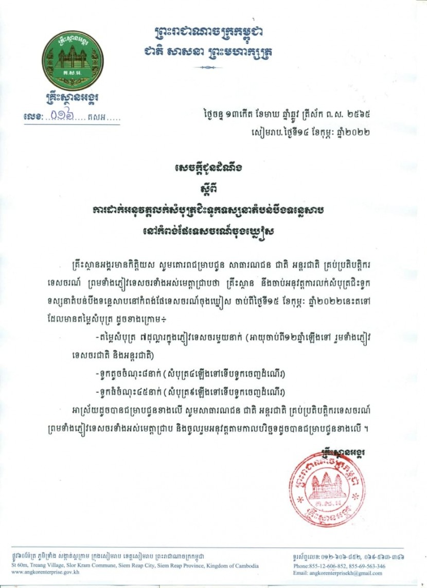 សេចក្តីជូនដំណឹងលេខ០១៦ របស់គ្រឹះស្ថានអង្គរ ចុះថ្ងៃទី១៤ ខែកុម្ភៈ ឆ្នាំ២០២២ ស្តីពី ការដាក់អនុវត្តលក់សំបុត្រជិះទូកទស្សនាតំបន់បឹងទន្លេសាបនៅកំពង់ផែទេសចរណ៍ចុងឃ្នៀស